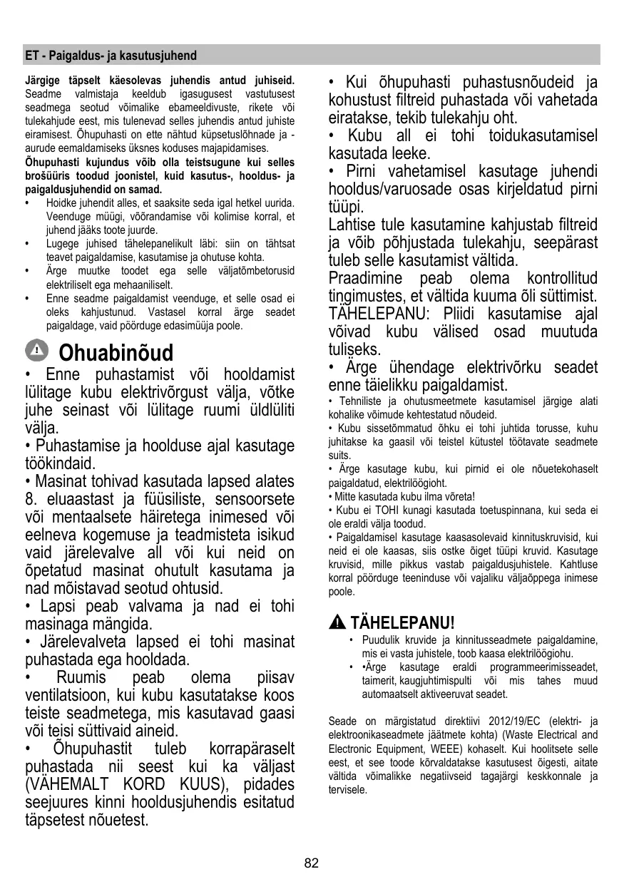 ! Utilice un conducto cuya longitud sea la mínima indispensable. ! Utilice un conducto con el menor número posible de curvas (ángulo máximo de la curva: 90°). La correcta eliminación de este producto evita consecuencias negativas para el medioambiente y la salud.