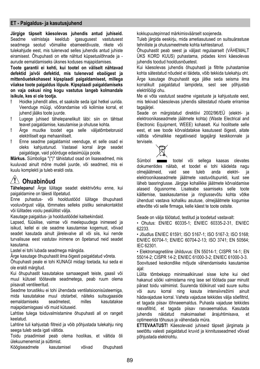 électroniques. Pour la mise au rebut, respectez les normes relatives à l’élimination des déchets en vigueur dans le pays d’installation. Pour obtenir de plus amples détails au sujet du traitement, de la récupération et du recyclage de cet appareil, veuillez vous adresser au bureau compétent de votre commune, à la société de collecte des déchets ou directement à votre revendeur. Appareil conçu, testé et fabriqué conformément aux normes suivantes : • Sécurité : EN/CEI 60335-1 ; EN/CEI 60335-2-31, EN/CEI 62233.