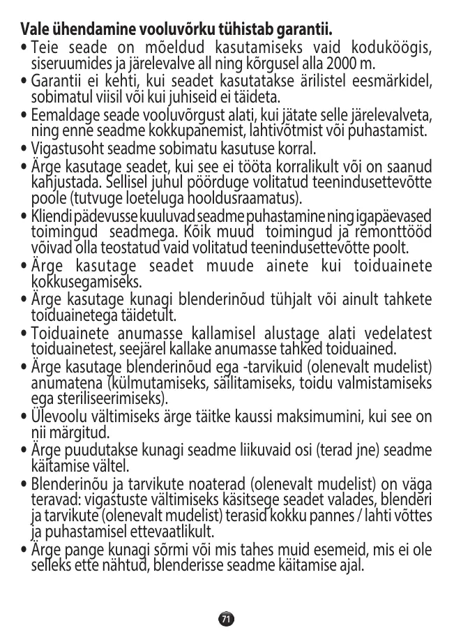 Toute erreur de branchement annule la garantie. • Votre appareil est destiné uniquement à un usage domestique à l’intérieur de la maison et à une altitude inférieure à 2000m. • La garantie ne s’appliquera pas en cas d’utilisation commerciale, inappropriée, ou non respect de la notice. • Toujours déconnecter l’appareil de l’alimentation si on le laisse sans surveillance et avant montage, démontage ou nettoyage. • Attention aux risques de blessure en cas de mauvaise utilisation de l’appareil. • N’utilisez pas votre appareil s’il ne fonctionne pas correctement ou s’il a été endommagé. Dans ce cas, adressez-vous à un centre service agréé (voir liste dans le livret service). • Toute intervention autre que le nettoyage et l’entretien usuel par le client doit être effectuée par un centre service agréé. • N’utilisez jamais cet appareil pour mélanger ou mixer d’autres éléments que des ingrédients alimentaires. • N’utilisez jamais le bol mixeur sans ingrédient ou avec des ingrédients solides uniquement. • Versez toujours les ingrédients liquides en premier dans le bol mixeur avant d’ajouter les ingrédients solides. • Ne pas utiliser le bol mixeur ou les accessoires (selon modèle) comme récipients (conservation, congélation, cuisson, stérilisation) • Afin d’éviter tout débordement, ne pas dépasser le niveau maximum du bol lorsque celui-ci est indiqué. • N e touchez jamais les pièces en mouvement (couteaux…). • Les lames du couteau du bol mixeur et des accessoires (selon modèle) sont très coupantes: manipulez-les avec précaution pour ne pas vous blesser lors du versage, du montage/démontage des 1
