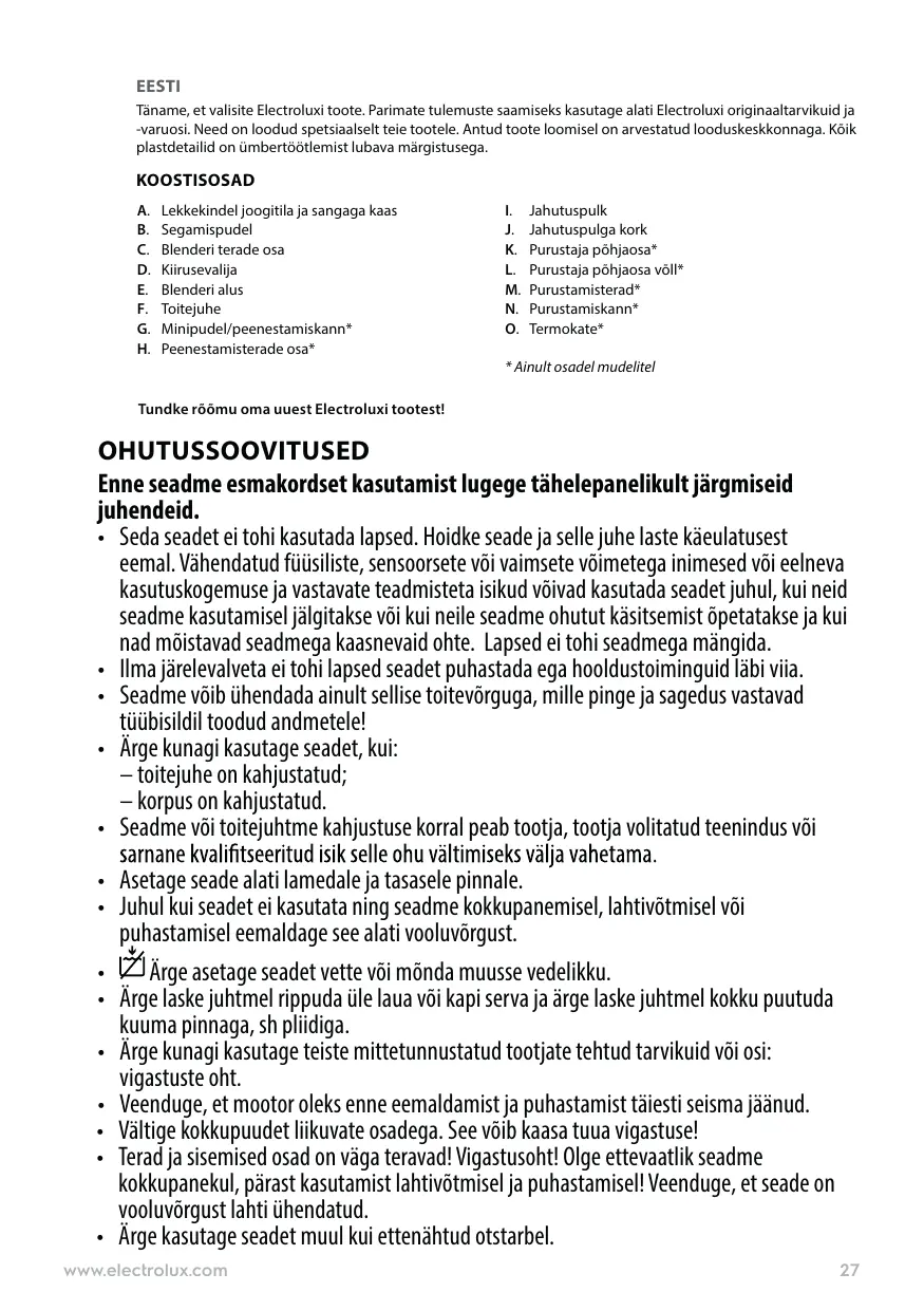OHUTUSSOOVITUSED Enne seadme esmakordset kasutamist lugege tähelepanelikult järgmiseid juhendeid. • Seda seadet ei tohi kasutada lapsed. Hoidke seade ja selle juhe laste käeulatusest eemal. Vähendatud füüsiliste, sensoorsete või vaimsete võimetega inimesed või eelneva kasutuskogemuse ja vastavate teadmisteta isikud võivad kasutada seadet juhul, kui neid seadme kasutamisel jälgitakse või kui neile seadme ohutut käsitsemist õpetatakse ja kui nad mõistavad seadmega kaasnevaid ohte. Lapsed ei tohi seadmega mängida. • Ilma järelevalveta ei tohi lapsed seadet puhastada ega hooldustoiminguid läbi viia. • Seadme võib ühendada ainult sellise toitevõrguga, mille pinge ja sagedus vastavad tüübisildil toodud andmetele! • Ärge kunagi kasutage seadet, kui: – toitejuhe on kahjustatud; – korpus on kahjustatud. • Seadme või toitejuhtme kahjustuse korral peab tootja, tootja volitatud teenindus või • Asetage seade alati lamedale ja tasasele pinnale. • Juhul kui seadet ei kasutata ning seadme kokkupanemisel, lahtivõtmisel või puhastamisel eemaldage see alati vooluvõrgust. Ärge asetage seadet vette või mõnda muusse vedelikku. • • Ärge laske juhtmel rippuda üle laua või kapi serva ja ärge laske juhtmel kokku puutuda kuuma pinnaga, sh pliidiga. • Ärge kunagi kasutage teiste mittetunnustatud tootjate tehtud tarvikuid või osi: vigastuste oht. • Veenduge, et mootor oleks enne eemaldamist ja puhastamist täiesti seisma jäänud. • Vältige kokkupuudet liikuvate osadega. See võib kaasa tuua vigastuse! • Terad ja sisemised osad on väga teravad! Vigastusoht! Olge ettevaatlik seadme kokkupanekul, pärast kasutamist lahtivõtmisel ja puhastamisel! Veenduge, et seade on vooluvõrgust lahti ühendatud. • Ärge kasutage seadet muul kui ettenähtud otstarbel. www.electrolux.com