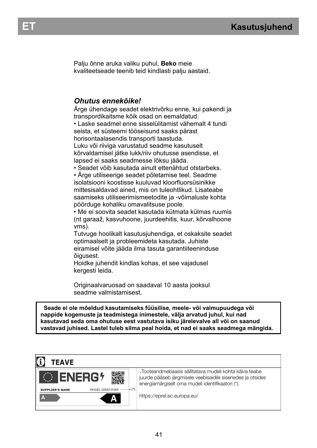 Ärge ühendage seadet elektrivõrku enne, kui pakendi ja transpordikaitsme kõik osad on eemaldatud. • Laske seadmel enne sisselülitamist vähemalt 4 tundi seista, et süsteemi tööseisund saaks pärast horisontaalasendis transporti taastuda. Luku või riiviga varustatud seadme kasutuselt kõrvaldamisel jätke lukk/riiv ohutusse asendisse, et lapsed ei saaks seadmesse lõksu jääda. • Seadet võib kasutada ainult ettenähtud otstarbeks. • Ärge utiliseerige seadet põletamise teel. Seadme isolatsiooni koostisse kuuluvad kloorfluorsüsinikke mittesisaldavad ained, mis on tuleohtlikud. Lisateabe saamiseks utiliseerimismeetodite ja -võimaluste kohta pöörduge kohaliku omavalitsuse poole. • Me ei soovita seadet kasutada kütmata külmas ruumis (nt garaaž, kasvuhoone, juurdeehitis, kuur, kõrvalhoone vms). Tutvuge hoolikalt kasutusjuhendiga, et oskaksite seadet optimaalselt ja probleemideta kasutada. Juhiste eiramisel võite jääda ilma tasuta garantiiteeninduse õigusest. Hoidke juhendit kindlas kohas, et see vajadusel kergesti leida. Originaalvaruosad on saadaval 10 aasta jooksul seadme valmistamisest. Seade ei ole mõeldud kasutamiseks füüsilise, meele- või vaimupuudega või nappide kogemuste ja teadmistega inimestele, välja arvatud juhul, kui nad kasutavad seda oma ohutuse eest vastutava isiku järelevalve all või on saanud vastavad juhised. Lastel tuleb silma peal hoida, et nad ei saaks seadmega mängida.