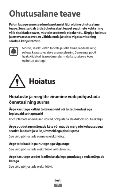 Ohutusalane teave Palun lugege enne seadme kasutamist läbi oluline ohutusalane teave. See sisaldab üldist ohutusalast teavet seadmete kohta ning võib sisaldada teavet, mis teie seadmele ei rakendu. Järgige hoiatusja ettevaatusteavet, et vältida enda ja teiste vigastamist ning seadme kahjustamist. Mõiste „seade” viitab tootele ja selle akule, laadijale ning sellega kaasasolevatele esemetele ning Samsungi poolt heakskiidetud lisaseadmetele, mida kasutatakse koos mainitud tootega. Hoiatus Hoiatuste ja reeglite eiramine võib põhjustada õnnetusi ning surma Ärge kasutage katkisi toitekaableid või toiteühendusi ega logisevaid seinapesasid Kontrollimata ühendused võivad põhjustada elektrilööki või tulekahju. Ärge puudutage märgade käte või muude märgade kehaosadega seadet, laadurit ja selle juhtmeid ega pistikupesa See võib põhjustada surmava elektrilöögi. Ärge toitekaablit painutage ega vigastage See võib põhjustada elektrilööki või tulekahju. Ärge kasutage seadet laadimise ajal ega puudutage seda märgade kätega See võib põhjustada elektrilööki. Eesti