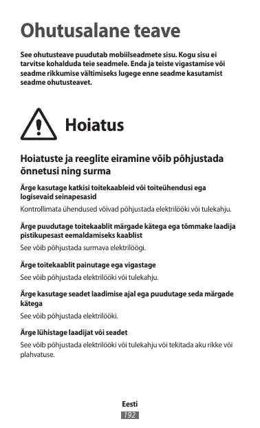 Ohutusalane teave See ohutusteave puudutab mobiilseadmete sisu. Kogu sisu ei tarvitse kohalduda teie seadmele. Enda ja teiste vigastamise või seadme rikkumise vältimiseks lugege enne seadme kasutamist seadme ohutusteavet. Hoiatus Hoiatuste ja reeglite eiramine võib põhjustada õnnetusi ning surma Ärge kasutage katkisi toitekaableid või toiteühendusi ega logisevaid seinapesasid Kontrollimata ühendused võivad põhjustada elektrilööki või tulekahju. Ärge puudutage toitekaablit märgade kätega ega tõmmake laadija pistikupesast eemaldamiseks kaablist See võib põhjustada surmava elektrilöögi. Ärge toitekaablit painutage ega vigastage See võib põhjustada elektrilööki või tulekahju. Ärge kasutage seadet laadimise ajal ega puudutage seda märgade kätega See võib põhjustada elektrilööki. Ärge lühistage laadijat või seadet See võib põhjustada elektrilööki või tulekahju või tekitada aku rikke või plahvatuse. Eesti
