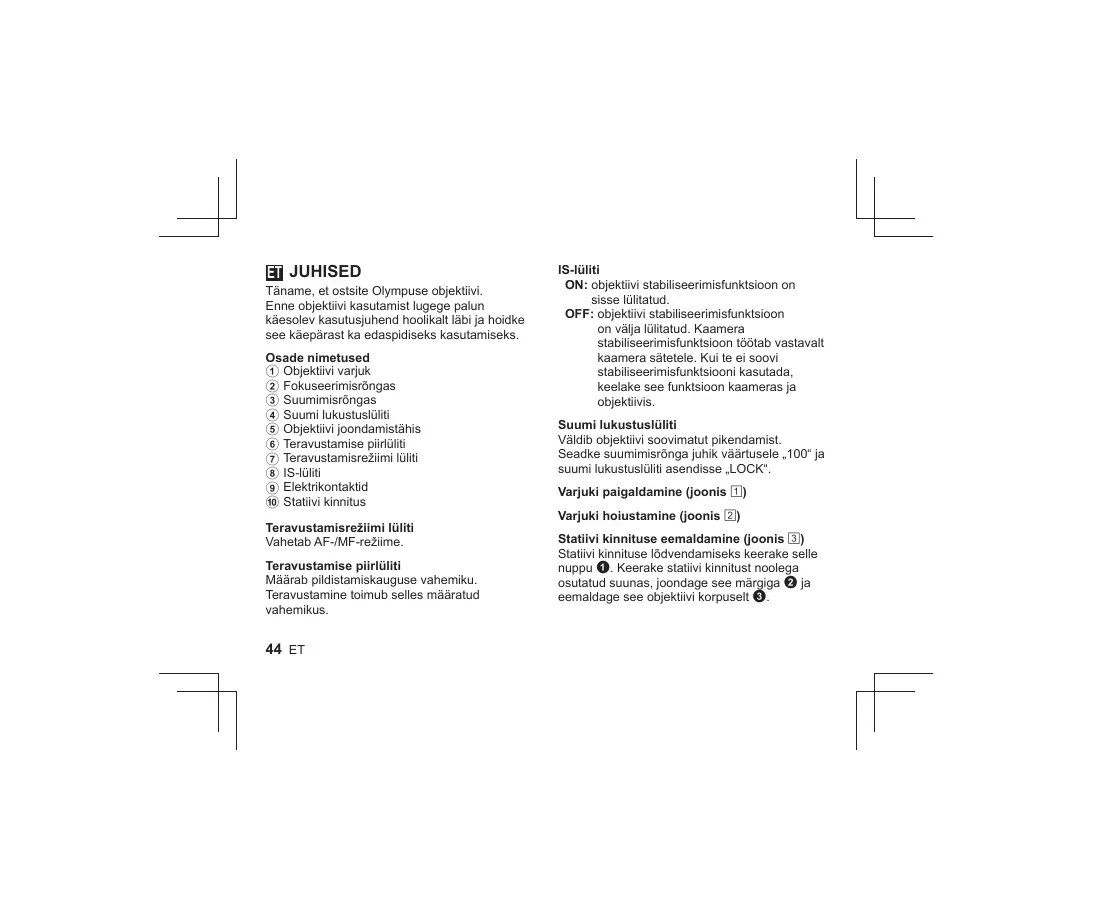 Visite nuestra página web http://www.olympus-europa.com o Ilame al: 5 Marca de montagem 6 Interruptor limitador de focagem 7 Interruptor de modo de focagem 8 Interruptor IS 9 Contactos elétricos 0 Encaixe do tripé Interruptor de modo de focagem 6 Comutator de limitare a focalizării 7 Comutator pentru modul de focalizare 8 Comutator IS 9 Contacte electrice