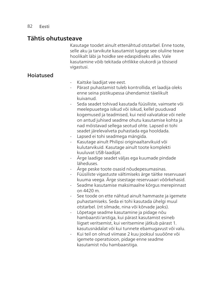 N’utilisez que des accessoires et des consommables Philips d’origine. Utilisez uniquement le bloc d’alimentation amovible WAAxxxx. Tenez le produit et les piles à l’abri du feu et ne les exposez pas directement aux rayons du soleil ou à des températures élevées. Si le produit devient anormalement chaud, dégage une odeur, change de couleur ou si la charge prend plus de temps que d’habitude, cessez d’utiliser et de charger le produit et contactez Philips.