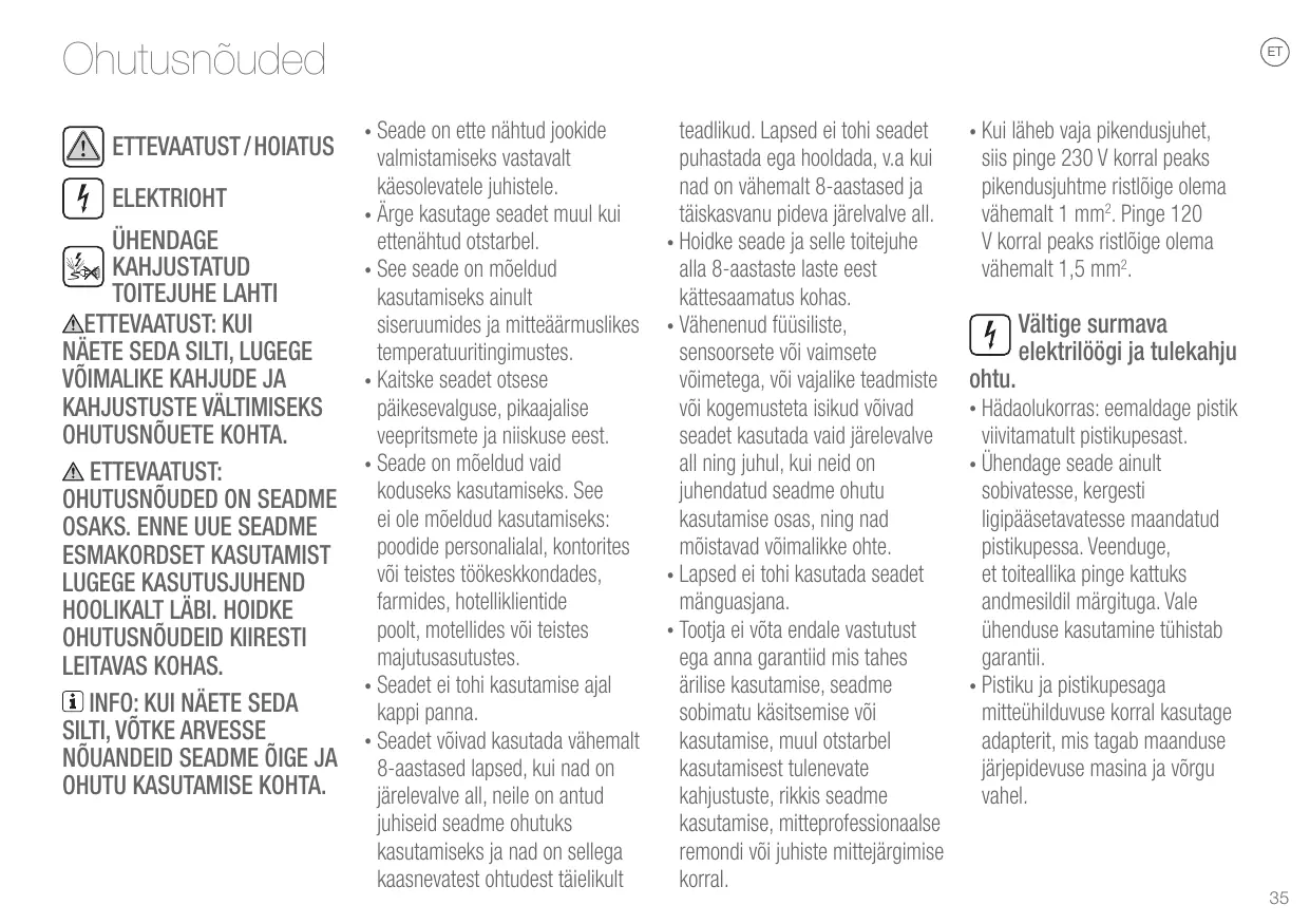 ET Ohutusnõuded Seadet tohib ühendada vooluvõrku alles pärast paigaldamist.