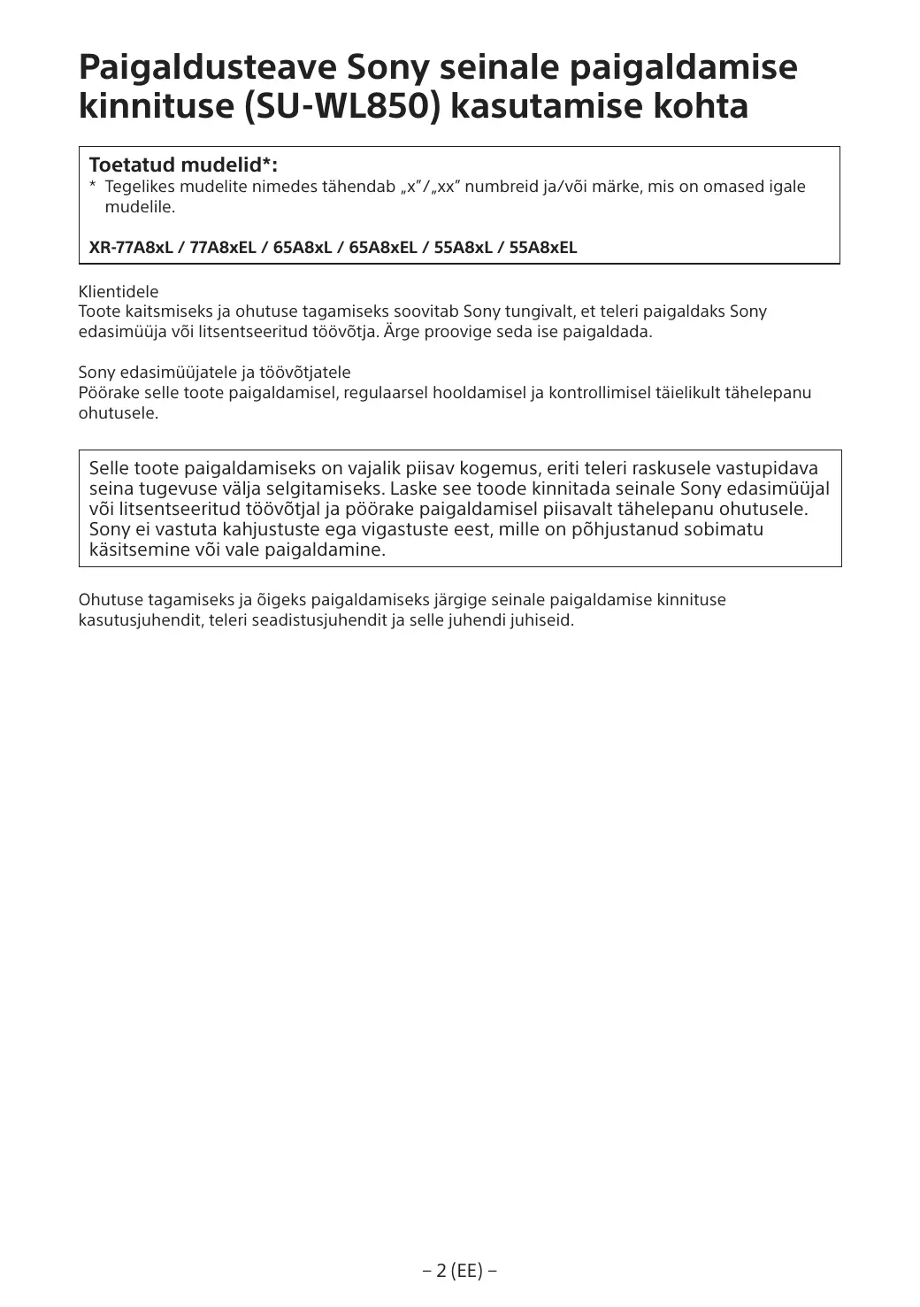 Pour des raisons de protection du produit et de sécurité, Sony recommande vivement que l’installation de votre téléviseur soit effectuée par un revendeur Sony ou un installateur agréé. N’essayez pas de l’installer vous-même. A l’attention des revendeurs et installateurs Sony Soyez particulièrement attentif à la sécurité pendant l’installation, l’entretien périodique et l’examen du produit.