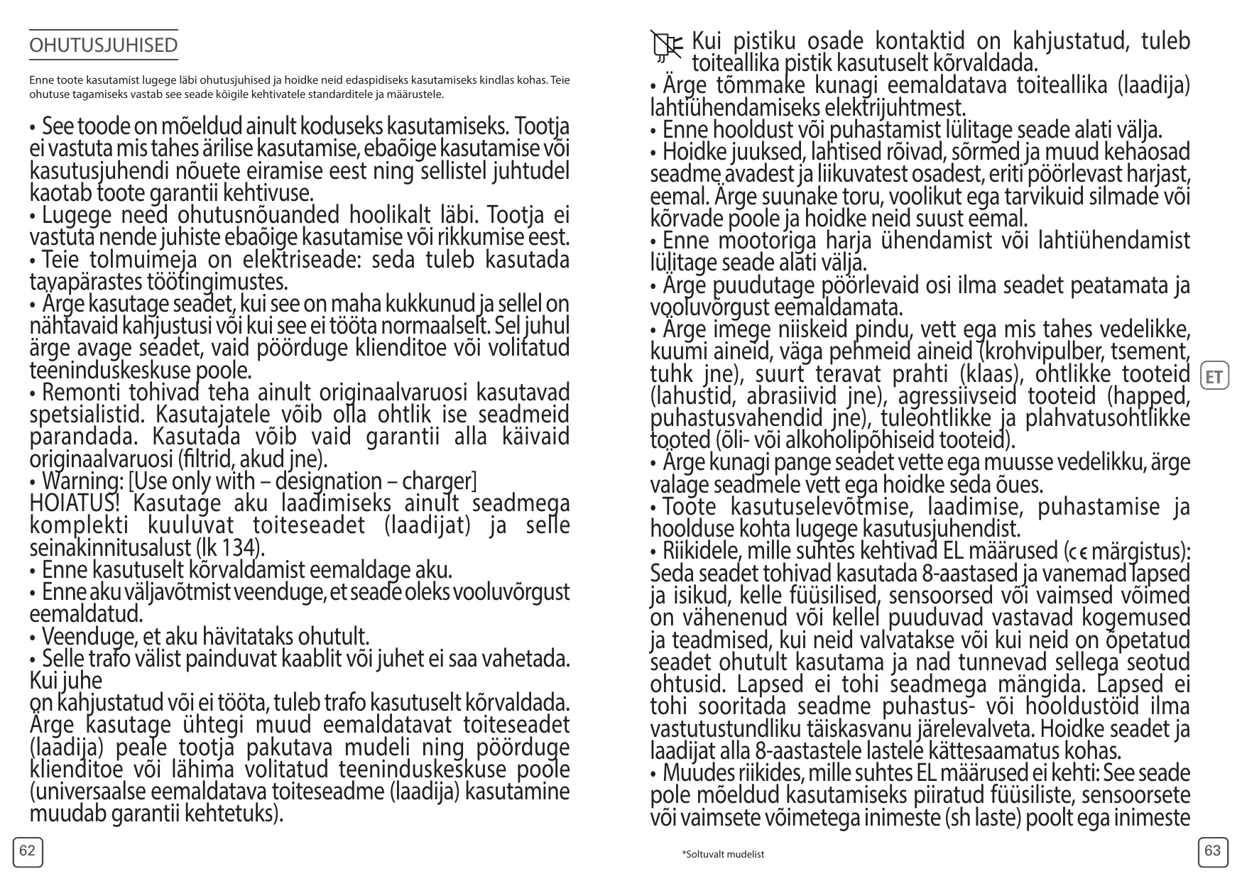 Kui pistiku osade kontaktid on kahjustatud, tuleb toiteallika pistik kasutuselt kõrvaldada. • Ärge tõmmake kunagi eemaldatava toiteallika (laadija) lahtiühendamiseks elektrijuhtmest. • Enne hooldust või puhastamist lülitage seade alati välja. • Hoidke juuksed, lahtised rõivad, sõrmed ja muud kehaosad seadme avadest ja liikuvatest osadest, eriti pöörlevast harjast, eemal. Ärge suunake toru, voolikut ega tarvikuid silmade või kõrvade poole ja hoidke neid suust eemal. • Enne mootoriga harja ühendamist või lahtiühendamist lülitage seade alati välja. • Ärge puudutage pöörlevaid osi ilma seadet peatamata ja vooluvõrgust eemaldamata. • Ärge imege niiskeid pindu, vett ega mis tahes vedelikke, kuumi aineid, väga pehmeid aineid (krohvipulber, tsement, tuhk jne), suurt teravat prahti (klaas), ohtlikke tooteid (lahustid, abrasiivid jne), agressiivseid tooteid (happed, puhastusvahendid jne), tuleohtlikke ja plahvatusohtlikke tooted (õli- või alkoholipõhiseid tooteid). • Ärge kunagi pange seadet vette ega muusse vedelikku, ärge valage seadmele vett ega hoidke seda õues. • Toote kasutuselevõtmise, laadimise, puhastamise ja hoolduse kohta lugege kasutusjuhendist. • Riikidele, mille suhtes kehtivad EL määrused ( märgistus): Seda seadet tohivad kasutada 8-aastased ja vanemad lapsed ja isikud, kelle füüsilised, sensoorsed või vaimsed võimed on vähenenud või kellel puuduvad vastavad kogemused ja teadmised, kui neid valvatakse või kui neid on õpetatud seadet ohutult kasutama ja nad tunnevad sellega seotud ohtusid. Lapsed ei tohi seadmega mängida. Lapsed ei tohi sooritada seadme puhastus- või hooldustöid ilma vastutustundliku täiskasvanu järelevalveta. Hoidke seadet ja laadijat alla 8-aastastele lastele kättesaamatus kohas. • Muudes riikides, mille suhtes EL määrused ei kehti: See seade pole mõeldud kasutamiseks piiratud füüsiliste, sensoorsete või vaimsete võimetega inimeste (sh laste) poolt ega inimeste *Soltuvalt mudelist