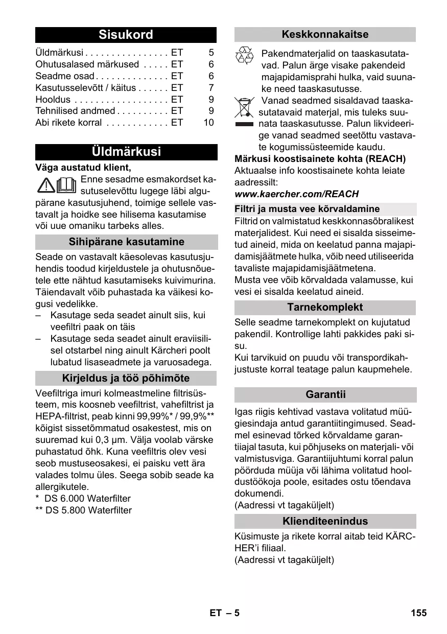 (REACH) Les informations actuelles relatives aux ingrédients se trouvent sous : www.kaercher.com/REACH Elimination du filtre et de l'eau sale Les filtres sont fabriqués en matériaux respectueux de l'environnement. S'ils ne contiennent aucune substance aspirée dont l'élimination est interdite dans les déchets ménagers, vous pouvez les jeter dans les déchets ordinaires. L'eau sale peut être éliminée dans l'écoulement, dans la mesure où elle ne contient pas de substances interdites.