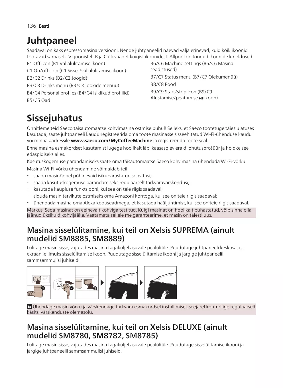B6/C6 Machine settings (Paramètres de la machine) C1 On/off icon (Icône marche/arrêt) B2/C2 Drinks (Boissons) Votre machine à café Saeco entièrement automatique vous permet de vous connecter à votre réseau Wi-Fi pour une expérience optimale. En connectant votre machine à votre réseau Wi-Fi, vous pourrez : - recevoir des recommandations personnalisées basées sur l’apprentissage machine ; - bénéficier de mises à jour logicielles régulières pour améliorer votre expérience utilisateur ; - accéder à la boutique (sous réserve de disponibilité dans votre pays) ; - associer votre machine à votre compte Amazon (sous réserve de disponibilité dans votre pays) pour vos réapprovisionnements en accessoires ; - vous connecter à votre appareil Alexa et commander vocalement votre machine (sous réserve de disponibilité dans votre pays). Remarque : Cette machine a été testée avec du café. Bien qu'elle ait été soigneusement nettoyée, il se peut que quelques résidus de café subsistent. Nous garantissons néanmoins que la machine est entièrement neuve.