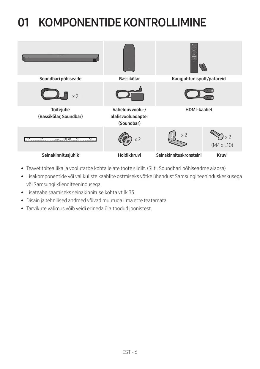 + _Kui lülitate seadme sisse, tekib enne heli kôlamist 4 kuni 5 sekundi pikkune viivitus. +_Kui kuulete heli ni telerist kui ka Soundbarist, avage teleri heli menüü Seaded ja seadke teleri kôlar valikule Väline kôlar.