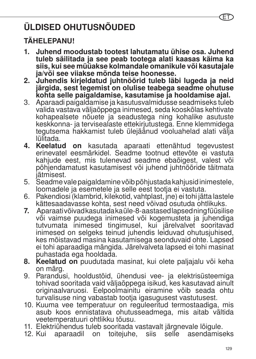 Seadme vale paigaldamine vôib pôhjustada kahjusidinimestele, loomadele ja esemetele ja selle eest tootja ei vastuta. Pakendiosi (kambrid, kilekotid, vahtplast, jne) eitohi jätta lastele kättesaadavasse kohta, sest need vüivad osutuda ohtlikuks. Aparaativôivadkasutadakaüle-8-aastasedlapsedningfüüsilise vôi vaimse puudega inimesed vüi kogemusteta ja juhendiga tutvumata inimesed tingimusel, kui järelvalvet sooritavad inimesed on selgeks teinud juhendis leiduvad ohutusjuhised, kes môistavad masina kasutamisega seonduvaid ohte. Lapsed ei tohi aparaadiga mängida. Järelvalveta lapsed ei tohi masinat puhastada ega hooldada.