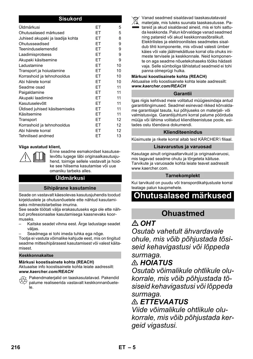 Ohutusseadised ET 9 Teeninduselemendid ET 9 Laadimisprotsess ET 9 Akupaki käsitsemine ET 9 Ladustamine ET 10 Transport ja hoiustamine ET 10 Korrashoid ja tehnohooldus ET 10 Abi häirete korral ET 10 Seadme osad ET 11 Paigaldamine ET 11 Akupaki laadimine ET 11 Kasutuselevüôtt ET 11 Üldised juhised käsitsemiseks ET 11 Käsitsemine ET 11 Transport ET 12 Korrashoid ja tehnohooldus ET 12 Abi häirete korral ET 12 Tehnilised andmed ET 13
