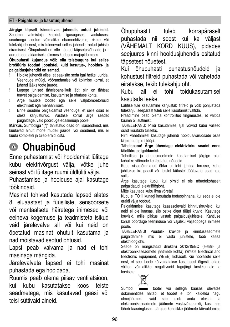 La hotte ne doit JAMAIS être uillsée comme une surface d'appui, sauf indication expresse.
