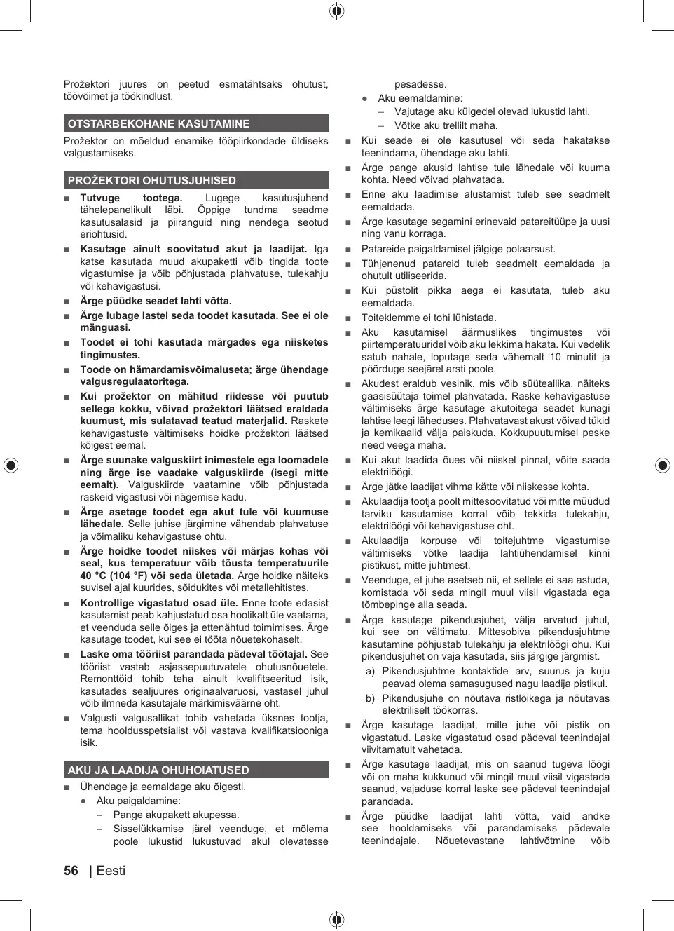 pirtemperatuuridel vôib aku lekkima hakata. Kui vedelik satub nahale, loputage seda vähemalt 10 minutit ja pôôrduge seejärel arsti poole. Akudest eraldub vesinik, mis vôib süüteallika, näiteks gaasisüütaja toimel plahvatada. Raske kehavigastuse vältimiseks ärge kasutage akutoitega seadet kunagi lahtise leegi läheduses. Plahvatavast akust vôivad tükid ja kemikaalid välja paiskuda. Kokkupuutumisel peske need veega maha. Kuï akut laadida dues vai niiskel pinnal, vôite saada elektriloôgi. Ârge jätke laadijat vihma kätte vôi nilskesse kohta Akulaadija tootja poolt mittesoovitatud vôi mitte müüdud taviku kasutamise korral vüib tekkida tulekahju, elektriléägi vai kehavigastuse oht Akulaadija korpuse väi toitejuhime … vigastumise vältimiseks vôtke laadija lahtühendamisel _ kinni pistikust, mitte juhtmest. Veenduge, et juhe asetseb nif, et sellele ei saa astuda, komistada vôi seda mingil muul viisil vigastada ega tômbepinge alla seada. Ârge kasutage pikendusjuhet, välja arvatud juhul, kui see on vältimatu. Mitesobiva pikendusjuhtme kasutamine pôhjustab tulekahju ja elektrilägi ohu. Kui pikendusjuhet on vaja kasutada, sis järgige järgmist 2) Pikendusjuhtme kontaktide arv, suurus ja kuju peavad olema samasugused nagu laadija pistikul. b) Pikendusjuhe on nôutava ristläikega ja nôutavas elektrliselt t66korras. Ârge kasutage laadiat, mille juhe vôi pistik on vigastatud. Laske vigastatud osad pädeval teenindajal viivitamatult vahetada. Ârge kasutage laadijat, mis on saanud tugeva l6ôgi vôi on maha kukkunud vôi mingil muul visil vigastada saanud, vajaduse korral laske see pädeval teenindajal parandada. Ârge püüdke laadijat lahti vôtta, vaid andke see hooldamiseks vôi_ parandamiseks _ pädevale teenindajale. Nüuetevastane lahtivôtmine … vôib