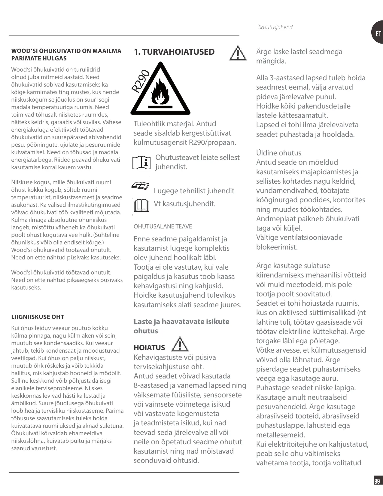 Niskuse kogus, mille Ghukuivati ruumi &hust kokku kogub, sôltub ruumi temperatuurist, niiskustasemest ja seadme asukohast. Ka välised ilmastikutingimused vôivad ôhukuivati t6ô kvaliteeti môjutada. Külma ilmaga absoluutne ôhuniiskus langeb, mistôttu väheneb ka Ghukuivati poolt 6hust kogutava vee hulk. (Suhteline 6huniiskus vôib olla endiselt kôrge.) Wood'si 6hukuivatid tôôtavad ohutult. Need on ette nähtud püsivaks kasutuseks.