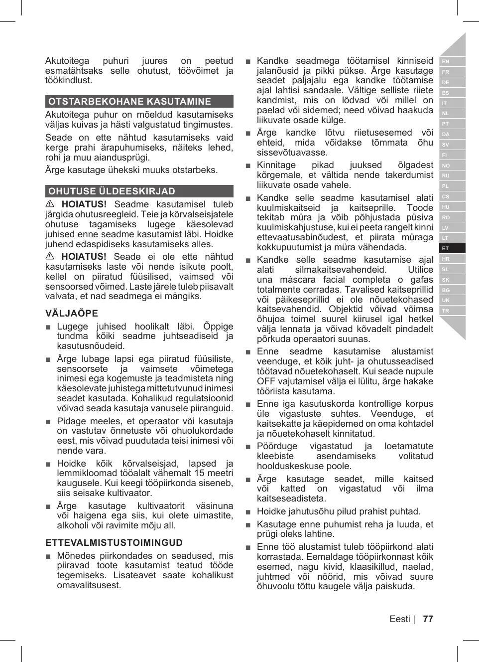 = Lugege juhised hoolikalt läbi. Ôppige tundma Kkôiki seadme juhtseadiseid ja kasutusnôudeid. Ârge lubage lapsi ega piratud füüsiliste, sensoorsete ja vaimsete vüimetega inimesi ega kogemuste ja teadmisteta ning käesolevate juhistega mittetutvunud inimesi seadet kasutada. Kohalikud regulatsioonid vôivad seada kasutaja vanusele piranguid. Pidage meeles, et operaator vôi kasutaja on vastutav ônnetuste vôi ohuolukordade eest, mis vôivad puudutada teisi inimesi vôi nende vara. Hoidke kôik kôrvalseisjad, lapsed ja lemmikloomad tô6alalt vähemalt 15 meetri kaugusele. Kui keegi toôpiirkonda siseneb, siis seisake kultivaator. = Ârge kasutage kultivaatorit väsinuna vôi haigena ega siis, kui olete uimastite, alkoholi vüi ravimite môju all. ETTEVALMISTUSTOIMINGUD = Mônedes piirkondades on seadused, mis piravad toote kasutamist teatud tôôde tegemiseks. Lisateavet saate kohalikust omavalitsusest. Kandke seadmega tôôtamisel kinniseid jalanôusid ja pikki pükse. Ârge kasutage seadet paljajalu ega kandke tôôtamise ajal lahtisi sandaale. Vältige selliste riiete kandmist, mis on lôdvad vôi millel on paelad vüi sidemed; need vôivad haakuda likuvate osade külge. Ârge kandke lôtvu rietusesemed vôi ehteid, mida vôidakse tômmata Ghu sissevôtuavasse. Kinnitage pikad juuksed ôlgadest kôrgemale, et vältida nende takerdumist liikuvate osade vahele. Kandke selle seadme kasutamisel alati kuulmiskaitseid ja kaitseprille. Toode tekitab müra ja vôib pôhjustada püsiva kuulmiskahjustuse, kui ei peeta rangeltkinni ettevaatusabinôudest, et pirata müraga kokkupuutumist ja müra vähendada. Kandke selle seadme kasutamise ajal alati silmakaitsevahendeid. Utilice una mäscara facial completa o gafas totalmente cerradas. Tavalised kaitseprillid vôi päikeseprillid ei ole nôuetekohased kaitsevahendid. Objektid vôivad vôimsa Ghujoa toimel suurel kirusel igal hetkel välja lennata ja vôivad kôvadelt pindadelt pôrkuda operaatori suunas. Enne seadme kasutamise alustamist veenduge, et küik juht- ja ohutusseadised tôôtavad nôuetekohaselt. Kui seade nupule OFF vajutamisel välja ei lülitu, ärge hakake toûriista kasutama. Enne iga kasutuskorda kontrollige korpus üle vigastuste suhtes. Veenduge, et kaitsekatte ja Käepidemed on oma kohtadel ja nôuetekohaselt kinnitatud. Pôôrduge vigastatud ja loetamatute kleebiste asendamiseks volitatud hoolduskeskuse poole. Ârge kasutage seadet, mille kaitsed vôi katted on vigastatud vôi ilma kaitseseadisteta. Hoidke jahutusGhu pilud prahist puhtad. Kasutage enne puhumist reha ja luuda, et prügi oleks lahtine. Enne t6ô alustamist tuleb tô korrastada. Eemaldage tü. esemed, nagu kivid, klaasikillud, naelad, juhtmed vôi nôürid, mis vüivad suure 6huvoolu tôttu kaugele välja paiskuda. rkond alati Eesti| 77