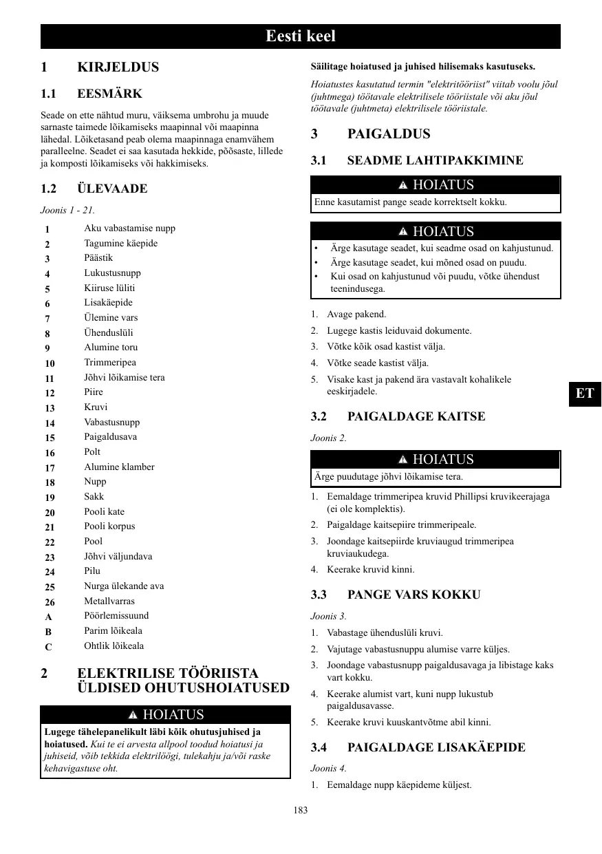 Dépannage... Données techniques .… Garantie. Déclaration de conformité CE... te machine sert à couper l'herbe, les petites broussailles et proximité du niveau du sol. Le