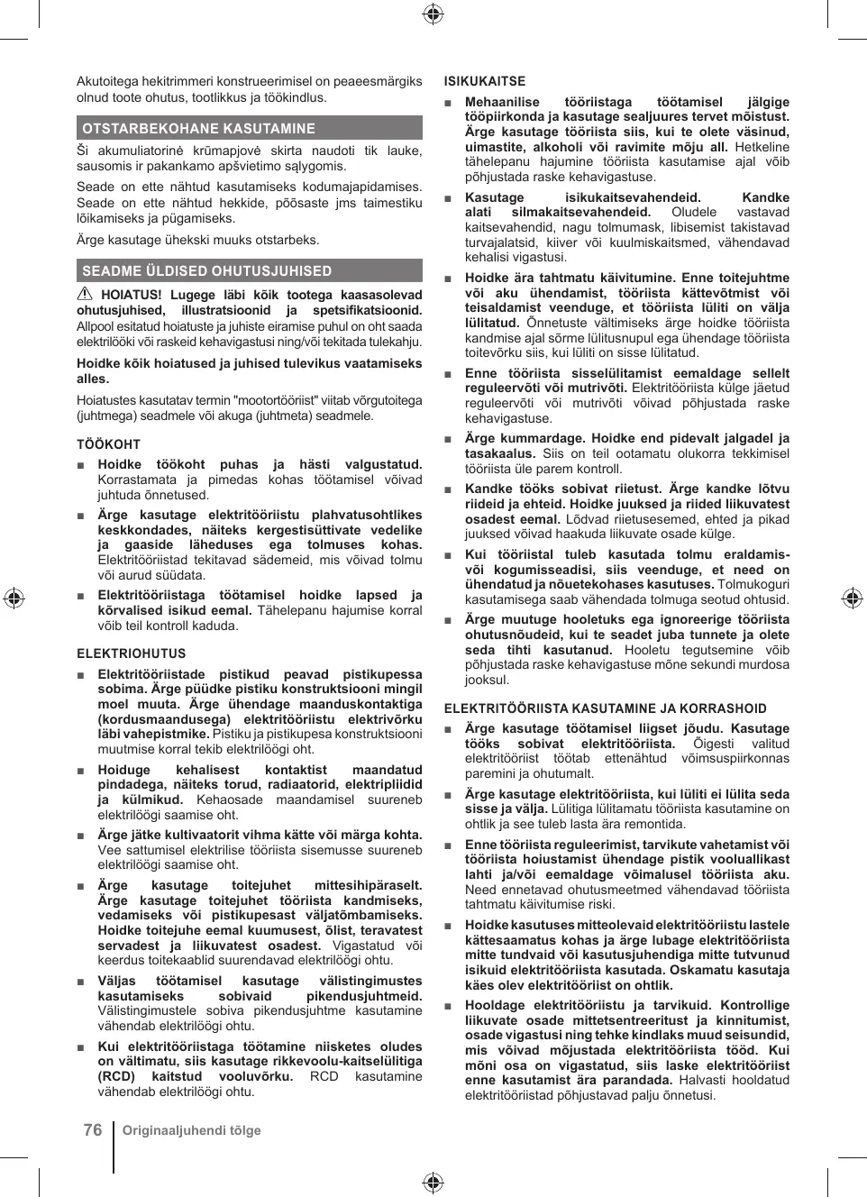 élagueur. = Lorsque vous utilisez le produit, tenez-le toujours fermement des deux mains par ses deux poignées. Vérifiez la machine avant chaque utilisation. Vérifiez le bon serrage des attaches, l'absence de fuite de carburant, etc. Assurez-vous que toutes les protections et toutes les poignées sont bien en place et bien verrouillés. Remplacez toute pièce endommagée avant utilisation. Vérifiez l'absence de fuite du pack batterie. = Chercher les objets cachés dans les haies et les buissons, tels que les barbelés et les branchements dissimulés.