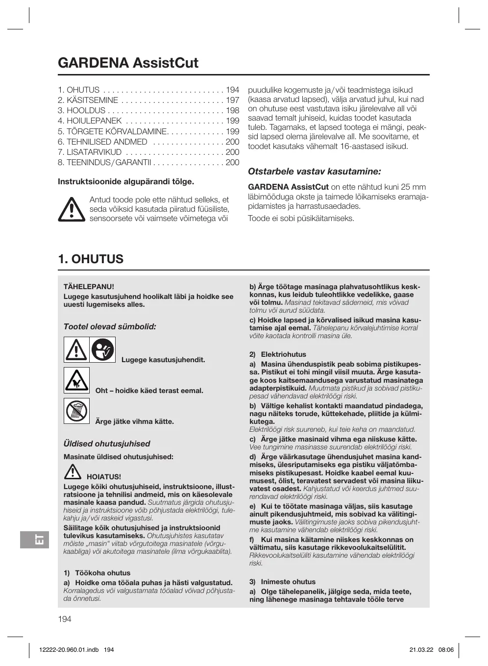 Téléchargez la notice de votre Elektrilised oksakäärid au format PDF gratuitement ! Retrouvez votre notice 12222 - GARDENA et reprennez votre appareil électronique en main. Sur cette page sont publiés tous les documents nécessaires à l'utilisation de votre appareil 12222 de la marque GARDENA.