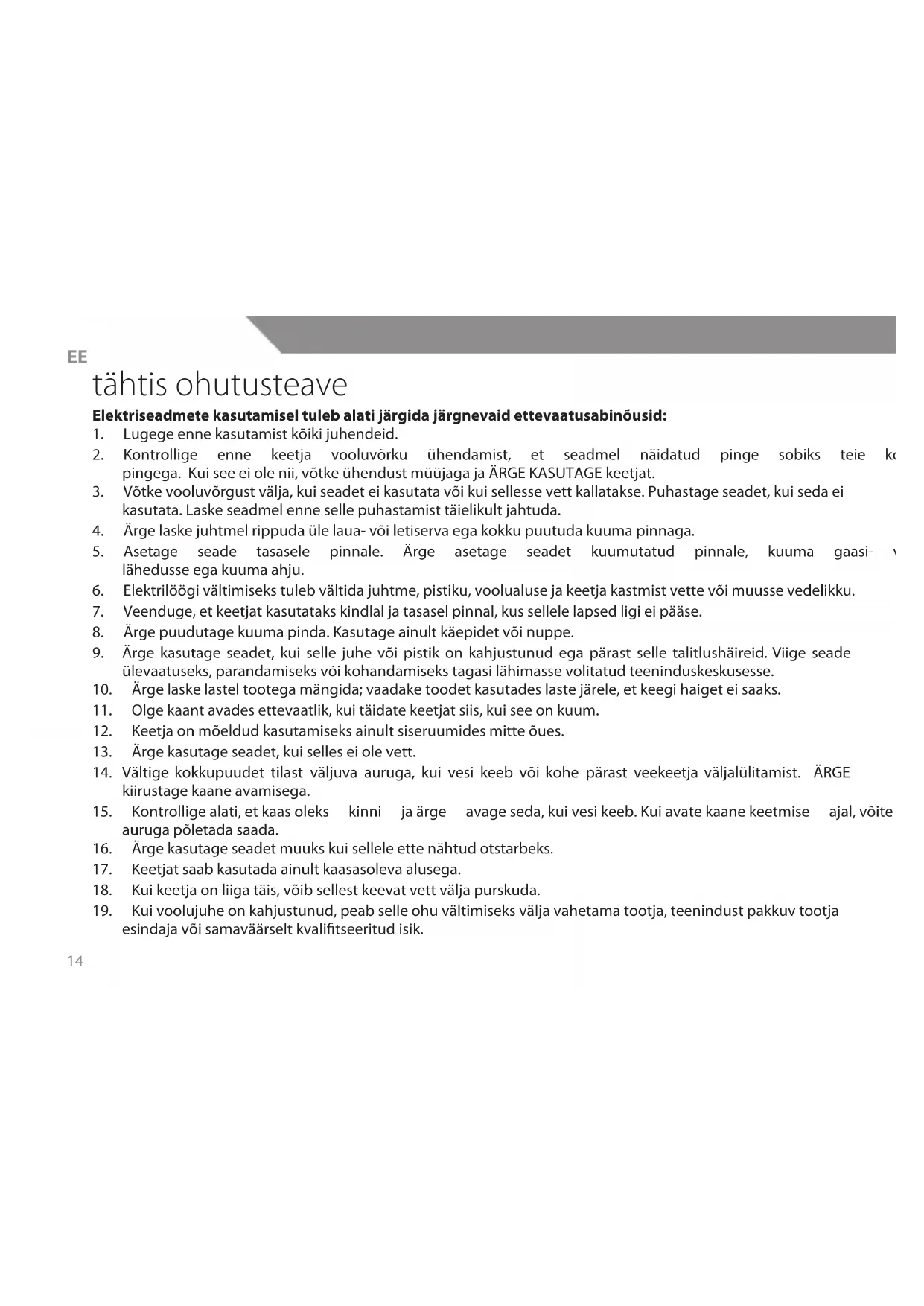 Elektriseadmete kasutamisel tuleb alati järgida järgnevaid ettevaatusinöusid: