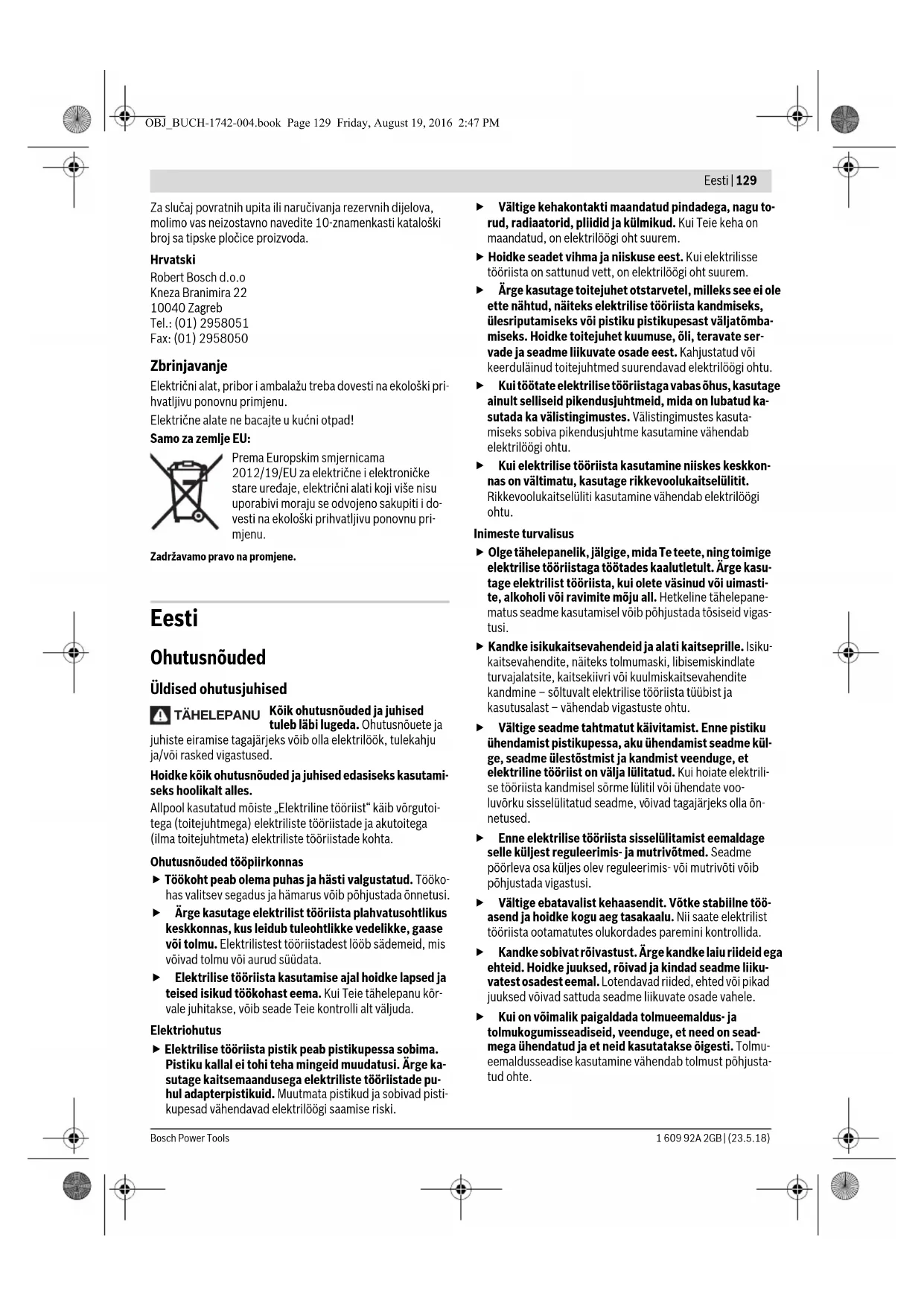Kaal EPTA-Procedure 01:2014 järgi kg 6,8 Kaitseaste /II Andmed kehtivad nimipingel [U] 230 V. Teistsuguste pingete ja kasu- tusriigis spetsiifiliste mudelite puhul võivad toodud andmed varieeruda. Asend löökpuurimiseks Kui tarvik ei hakka sisselülitamisel kohe pöör- lema, laske seadmel aeglaselt töötada, kuni tarvik kaasa pöörlema hakkab. OBJ_BUCH-1742-004.book Page 131 Friday, August 19, 2016 2:47 PM132 | Eesti 1 609 92A 2GB | (23.5.18) Bosch Power Tools Asendis „meiseldamine“ suureneb regulaatoriga 7 valitud löökide arv sisselülitamisel automaatselt; tänu sellele töötab seade meiseldamisel suurema jõudlusega. Sisselülitamine puurimisel Energia säästmiseks lülitage elektriline tööriist sisse vaid siis, kui seda kasutate. – Seadme kasutuselevõtuks vajutage lüliti (sisse/välja) 5 alla ja hoidke seda all. – Seadme väljalülitamiseks vabastage lüliti (sisse/välja) 5. Sisselülitamine meiseldamisel Energia säästmiseks lülitage elektriline tööriist sisse vaid siis, kui seda kasutate. – Seadme sisselülitamiseks suruge lüliti (sisse-/välja) 5 üles (I), kuni see lukustub. – Seadme väljalülitamiseks suruge lüliti (sisse-/välja) 5 alla (0) ja vabastage see. Madalate temperatuuride juures saavutab seade täieliku puu- rimis-/löögivõimsuse alles mõne aja pärast. Pöörete arvu/löökide arvu reguleerimine Elektrooniline reguleerimissüsteem võimaldab pöörete ja löö- kide arvu vastavalt töödeldavale materjalile sujuvalt reguleeri- da. Tänu konstantelektroonikale püsib valitud pöörete ja löökide arv nii koormuseta kui koormusega töötades peaaegu muutu- matuna. Võrgupistiku ühendamisel pistikupessa või pärast voolukat- kestust reguleerib elektroonika pöörded ja löögid automaat- selt maksimaalseiks. See hoiab ära selle, et regulaatori 7 ma- dala seadistuse tõttu ei tööta seadme optimaalse jõudlusega. – Valige regulaatoriga 7 töödeldava materjali jaoks sobivad pöörded. Järgnevas tabelis toodud andmed on soovituslikud. Ülekoormuskaitse Puurimistarviku kinnikiildumisel või haakumisel sead- me spindel seiskub. Sellega kaasnevate jõudude tasa- kaalustamiseks tuleb seadet hoida alati kahe käega ja võtta stabiilne tööasend. Seadme kinnikiildumise korral lülitage seade välja ja eemaldage tarvik. Kinnikiildunud tarvikuga seadme sisselülitamisel tekivad suured reaktsioonimomendid. Meisli asendi muutmine (Vario-Lock) Meislit saab lukustada 12 asendisse. Nii on võimalik valida op- timaalset tööasendit. – Asetage meisel padrunisse. –Keerake pöörlemise seiskamise lüliti 3 asendisse „Vario- Lock“ (vt „Töörežiimi valik“, lk131). – Pöörake padrun soovitud asendisse. –Keerake pöörlemise seiskamise lüliti 3 asendisse „meisel- damine“. Padrun on sellega lukustatud. Meiseldamisel peab pöörlemise seiskamise lüliti 3 ole- ma alati asendis „meiseldamine“. Tööjuhised Enne mistahes tööde teostamist elektrilise tööriista kallal tõmmake pistik pistikupesast välja. Vibratsioonisummutus Integreeritud vibratsioonisummutus vähendab tekkivat vib- ratsiooni. Pehmendiga käepide hoiab ära tööriista käestlibisemise ning tagab parema haarde ja käsitsetavuse. Hooldus ja teenindus Hooldus ja puhastus Enne mistahes tööde teostamist elektrilise tööriista kallal tõmmake pistik pistikupesast välja. Seadme laitmatu ja ohutu töö tagamiseks hoidke seade ja selle ventilatsiooniavad puhtad. Vigastatud tolmukaitse tuleb kohe välja vahetada. Tol- mukaitse väljavahetamiseks tuleks seade toimetada remonditöökotta. Tööohutuse tagamiseks tuleb toitejuhe lasta vajaduse korral vahetada Boschi elektriliste tööriistade volitatud parandus- töökojas. Asend Vario-Lock meisli asendi reguleerimi- seks Asend meiseldamiseks Kasutusala Regulaatori asend Krohvi/kergmaterjalide töötlemine Keraamiliste plaatide eemaldamine Telliskivi töötlemine Betooni töötlemine OBJ_BUCH-1742-004.book Page 132 Friday, August 19, 2016 2:47 PMLatviešu | 133 Bosch Power Tools1 609 92A 2GB | (23.5.18) Hoolduse indikaatortuli 8 Grafiitharjade tööressursi ammendumisel lülitub seade auto- maatselt välja. Seda signaliseerib umbes 8 tundi enne väljalü- litumist hoolduse indikaatortule 8 süttimine või vilkumine. Seade tuleb toimetada hoolduseks remonditöökotta, aadres- si leiate punktist „Klienditeenindus ja müügijärgne nõustami- ne“. Ooterežiimi indikaatortuli 9 Pistiku ühendamisel vooluvõrku ja võrgupinge olemasolul peab ooterežiimi indikaatortuli 9 süttima. Kui seadet, mille ooterežiimi indikaatortuli 9 põleb, ei saa sisse lülitada, tuleb see saata klienditeenindusse, aadress on toodud punktis „Klienditeenindus ja müügijärgne nõustamine“, lk 133. Klienditeenindus ja müügijärgne nõustamine Klienditeeninduses vastatakse toote paranduse ja hoolduse ning varuosade kohta esitatud küsimustele. Joonised ja teabe varuosade kohta leiate ka veebisaidilt: www.bosch-pt.com Boschi nõustajad osutavad Teile toodete ja tarvikute küsimus- tes meeleldi abi. Päringute esitamisel ja varuosade tellimisel näidake kindlasti ära seadme andmesildil olev 10-kohaline tootenumber. Eesti Vabariik Mercantile Group AS Boschi elektriliste käsitööriistade remont ja hooldus Pärnu mnt. 549 76401 Saue vald, Laagri Tel.: 6549 568 Faks: 679 1129 Kasutuskõlbmatuks muutunud seadmete käitlus Elektriseadmed, lisatarvikud ja pakendid tuleks keskkonna- säästlikult ringlusse võtta. Ärge visake kasutusressursi ammendanud elektrilisi tööriistu olmejäätmete hulka! Üksnes EL liikmesriikidele: Vastavalt Euroopa Parlamendi ja nõukogu direktiivile 2012/19/EL elektri- ja elektroo- nikaseadmete jäätmete kohta ning direktiivi kohaldamisele liikmesriikides tuleb kasutus- kõlbmatuks muutunud elektrilised tööriistad eraldi kokku koguda ja keskkonnasäästlikult korduskasutada või ringlusse võtta. Tootja jätab endale õiguse muudatuste tegemiseks. Latviešu Drošības noteikumi Vispārējie drošības 