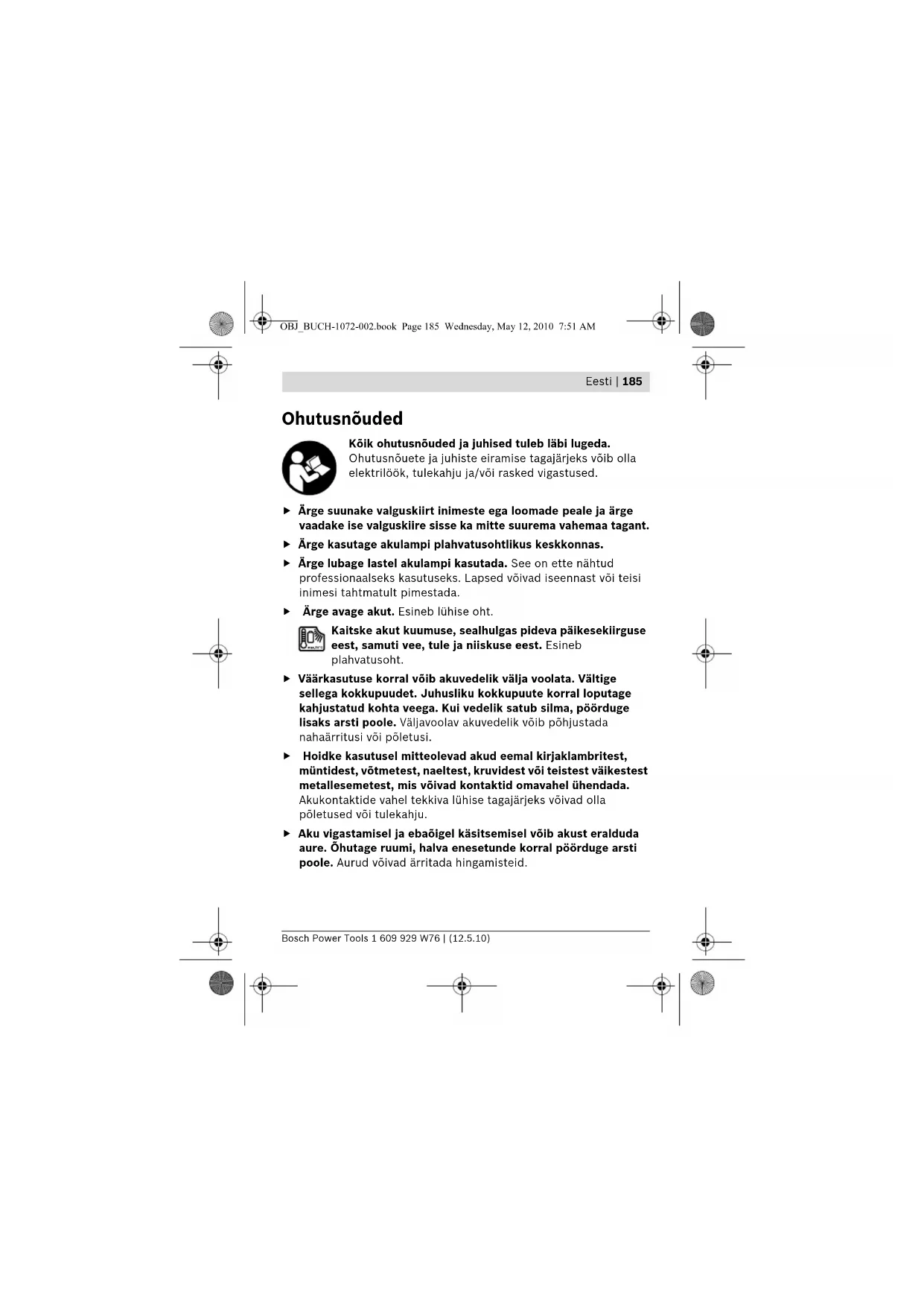 Ohutusnõuded Kõik ohutusnõuded ja juhised tuleb läbi lugeda. Ohutusnõuete ja juhiste eiramise tagajärjeks võib olla elektrilöök, tulekahju ja/või rasked vigastused. f Ärge suunake valguskiirt inimeste ega loomade peale ja ärge vaadake ise valguskiire sisse ka mitte suurema vahemaa tagant. f Ärge kasutage akulampi plahvatusohtlikus keskkonnas. f Ärge lubage lastel akulampi kasutada. See on ette nähtud professionaalseks kasutuseks. Lapsed võivad iseennast või teisi inimesi tahtmatult pimestada. f Ärge avage akut. Esineb lühise oht. Kaitske akut kuumuse, sealhulgas pideva päikesekiirguse eest, samuti vee, tule ja niiskuse eest. Esineb plahvatusoht. f Väärkasutuse korral võib akuvedelik välja voolata. Vältige sellega kokkupuudet. Juhusliku kokkupuute korral loputage kahjustatud kohta veega. Kui vedelik satub silma, pöörduge lisaks arsti poole. Väljavoolav akuvedelik võib põhjustada nahaärritusi või põletusi. f Hoidke kasutusel mitteolevad akud eemal kirjaklambritest, müntidest, võtmetest, naeltest, kruvidest või teistest väikestest metallesemetest, mis võivad kontaktid omavahel ühendada. Akukontaktide vahel tekkiva lühise tagajärjeks võivad olla põletused või tulekahju. f Aku vigastamisel ja ebaõigel käsitsemisel võib akust eralduda aure. Õhutage ruumi, halva enesetunde korral pöörduge arsti poole. Aurud võivad ärritada hingamisteid. OBJ_BUCH-1072-002.book Page 185 Wednesday, May 12, 2010 7:51 AM1 609 929 W76 | (12.5.10) Bosch Power Tools 186 | Eesti f Laadige akusid ainult tootja poolt soovitatud akulaadijatega. Akulaadija, mis sobib teatud tüüpi akudele, muutub tuleohtlikuks, kui seda kasutatakse teiste akudega. f Kasutage akut üksnes koos Boschi elektrilise tööriistaga. Ainult nii on aku kaitstud ohtliku ülekoormuse eest. f Kasutage üksnes Boschi originaalakusid, mille pinge vastab elektrilise tööriista andmesildil toodud pingele. Muude akude, nt järeletehtud või parandatud akude või teiste tootjate akude kasutamine põhjustab plahvatus- ja varalise kahju ohu. Tööpõhimõtte kirjeldus Nõuetekohane kasutamine Akulamp on ette nähtud kuivade, ruumiliselt piiratud piirkondade käsitsi valgustamiseks. Seadme osad Akulambi osade numeratsiooni aluseks on jooniste leheküljel toodud numbrid. 1 Lambi pea 2 Lüliti (sisse/välja) 3 Aku* 4 Aku vabastusklahv 5 Vööklamber *Tarnekomplekt ei sisalda kõiki kasutusjuhendis olevatel joonistel kujutatud või kasutusjuhendis nimetatud lisatarvikuid. Lisatarvikute täieliku loetelu leiate meie lisatarvikute kataloogist. OBJ_BUCH-1072-002.book Page 186 Wednesday, May 12, 2010 7:51 AMEesti | 187 Bosch Power Tools 1 609 929 W76 | (12.5.10) Tehnilised andmed Montaaž Aku laadimine (lisatarvik) (vt joonist A) f Kasutage üksnes lisatarvikute leheküljel nimetatud akulaadijaid. Üksnes need laadijad on kohandatud akulambi juures kasutatud liitium-ioon-aku laadimiseks. Märkus: Aku on tarnimisel osaliselt laetud. Et tagada aku täit mahtuvust, laadige aku enne esmakordset kasutamist akulaadimisseadmes täiesti täis. Li-ioon-akut võib laadida igal ajal, ilma et see lühendaks aku kasutusiga. Laadimise katkestamine ei kahjusta akut. Liitium-ioon-akut kaitseb täieliku tühjenemise eest elementide elektrooniline kaitse „Electronic Cell Protection (ECP)“. Tühjenenud aku korral lülitab kaitselüliti akulambi välja. Pärast akulambi automaatset väljalülitamist ärge vajutage enam lülitile (sisse/välja). Aku võib kahjustuda. Akulamp GLI 10,8 V-LI Professional Tootenumber 3 601 D37 U.. Nimipinge V= 10,8 Põlemisaeg ca min 450 Töötemperatuur °C –10 ... +40 Hoiutemperatuur °C –15 ... +50 Kaal EPTA-Procedure 01/2003 järgi kg 0,3 Pöörake palun tähelepanu akulambi andmesildil toodud tootenumbrile. Akulampide kaubanduslik tähistus võib olla erinev. TÄHELEPANU OBJ_BUCH-1072-002.book Page 187 Wednesday, May 12, 2010 7:51 AM1 609 929 W76 | (12.5.10) Bosch Power Tools 188 | Eesti Aku 3 eemaldamiseks vajutage vabastusklahvidele 4 ja tõmmake aku akulambist suunaga taha välja. Ärge rakendage seejuures jõudu. Aku on varustatud NTC-temperatuurikontrolliga, mis lubab akut laadida üksnes temperatuuril 0 °C kuni 45 °C. See tagab aku pika kasutusea. Järgige kasutusressursi ammendanud seadmete käitlemise juhiseid. Kasutus Seadme kasutuselevõtt Aku paigaldamine f Kasutage üksnes Boschi originaal-liitium-ioon-akusid, mille pinge vastab akulambi andmesildil toodud pingele. Teiste akude kasutamine võib põhjustada vigastusi ja tulekahju ohtu. Asetage laetud aku 3 pidemesse, kuni see tuntavalt kohale fikseerub ja pidemega ühetasa asub. Sisse-/väljalülitus f Akulamp tekitav valguskiire, mis väljub lambi peast 1. Akulambi sisselülitamiseks suruge lüliti (sisse/välja) 2 üles. Akulambi väljalülitamiseks vajutage uuesti lülitile (sisse/välja) 2. Kaitse täieliku tühjenemise vastu Liitium-ioon-akut kaitseb täieliku tühjenemise eest elementide elektrooniline kaitse „Electronic Cell Protection (ECP)“. Tühjenenud aku korral lülitab kaitselüliti akulambi välja. Tööjuhised Vööklamber (vt joonist B) Vööklambriga 5 saate akulambi riputada näiteks vööle. Nii jäävad Teil mõlemad käed vabaks ja akulamp on igal ajal haardeulatuses. OBJ_BUCH-1072-002.book Page 188 Wednesday, May 12, 2010 7:51 AMEesti | 189 Bosch Power Tools 1 609 929 W76 | (12.5.10) Hooldus ja teenindus Hooldus ja puhastus Kui aku enam ei tööta, pöörduge palun Boschi elektriliste tööriistade volitatud remonditöökotta. Akulamp ei vaja hooldust ega sisalda osi, mida tuleb vahetada või hooldada. Vigastuste vältimiseks puhastage akulambi plastist klaasi üksnes kuiva pehme lapiga. Ärge kasutage puhastusvahendeid ega lahusteid. Akulamp on hoolikalt valmistatud ja testitud. Kui akulamp sellest hoolimata rikki läheb, tuleb see lasta parandada Boschi elektriliste tööriistade volitatud parandustöökojas. Järelepärimiste esitamisel ja tagavaraosade tellimisel esitage kindlasti akulambi andmesildil