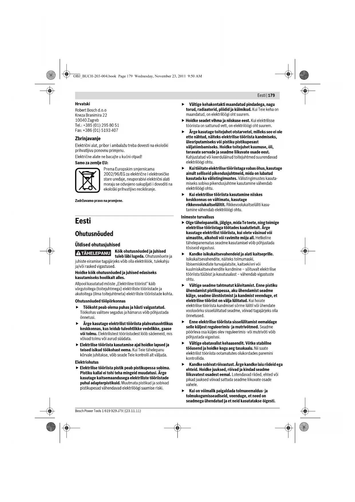 fiksiranje dubine zarezivanja. – Odvijte vijak s upuštenom glavom 49. Uvijte vijak sa cilindričnom glavom 48 u za to predviđene provrte, tako da je klizna ploča 9 slobodno pomična. – Umetnite trn za centriranje 50 u stezač alata, kako je prikazano na slici. Rukom stegnite završnu maticu, tako da je trn za centriranje još uvijek slobodno pomičan. – Međusobno izravnajte trn za centriranje 50 i kopirnu čahuru 47 manjim pomicanjem klizne ploče 9. – Stegnite vijak sa cilindričnom glavom 48. – Uklonite trn za centriranje 50 iz stezača alata. – Pritisnite polugu za deblokiranje 22 i vodite vertikalnu glodalicu u najviši položaj. Kod glodanja sa kopirnom čahurom 47 postupite kako slijedi: – Uključeni električni alat sa kopirnom čahurom približite šabloni. – Pritisnite polugu za deblokiranje 22 prema dolje i vodite vertikalnu glodalicu polako prema dolje, sve dok se ne dosegne namještena dubina glodanja. Ponovno otpustite polugu za deblokiranje 22 za fiksiranje dubine zarezivanja. – Električni alat sa nadvisujućom kopirnom čahurom vodite s bočnim pritiskom uzduž šablone. Održavanje i servisiranje Održavanje i čišćenje f Prije svih radova na električnom alatu izvucite mrežni utikač iz utičnice. f Električni alat i otvore za hlađenje održavajte čistim kako bi se moglo dobro i sigurno raditi. f Kod ekstremnih uvjeta primjene po mogućnosti uvijek treba koristiti usisni uređaj. Često ispuhavajte otvore za hlađenje i predspojite zaštitnu sklopku struje kvara (FI). Kod obrade metala vodljiva prašina se može nakupiti unutar električnog alata. To može negativno utjecati na zaštitnu izolaciju električnog alata. Ako je potrebna zamjena priključnog kabela, tada je treba provesti u Bosch servisu ili u ovlaštenom servisu za Bosch električne alate, kako bi se izbjeglo ugrožavanje sigurnosti. Ako bi električni alat unatoč brižljivih postupaka izrade i ispitivanja ipak prestao raditi, popravak treba prepustiti ovlaštenom servisu za Bosch električne alate. Za slučaj povratnih upita ili naručivanja rezervnih dijelova, molimo vas neizostavno navedite 10-znamenkasti kataloški broj sa tipske pločice električnog alata. Servis za kupce i savjetovanje kupaca Naš servis će odgovoriti na vaša pitanja o popravku i održavanju vašeg proizvoda, kao i o rezervnim dijelovima. Crteže u rastavljenom obliku i informacije o rezervnim dijelovima možete naći i na našoj adresi: www.bosch-pt.com Tim Bosch savjetnika za kupce rado će odgovoriti na vaša pitanja o kupnji, primjeni i podešavanju proizvoda i pribora. OBJ_BUCH-203-004.book Page 178 Wednesday, November 23, 2011 9:50 AMEesti | 179 Bosch Power Tools 1 619 929 J79 | (23.11.11) Hrvatski Robert Bosch d.o.o Kneza Branimira 22 10040 Zagreb Tel.: +385 (01) 295 80 51 Fax: +386 (01) 5193 407 Zbrinjavanje Električni alat, pribor i ambalažu treba dovesti na ekološki prihvatljivu ponovnu primjenu. Električne alate ne bacajte u kućni otpad! Samo za zemlje EU: Prema Europskim smjernicama 2002/96/EG za električne i elektroničke stare uređaje, neuporabivi električni alati moraju se odvojeno sakupljati i dovoditi na ekološki prihvatljivo recikliranje. Zadržavamo pravo na promjene. Eesti Ohutusnõuded Üldised ohutusjuhised Kõik ohutusnõuded ja juhised tuleb läbi lugeda. Ohutusnõuete ja juhiste eiramise tagajärjeks võib olla elektrilöök, tulekahju ja/või rasked vigastused. Hoidke kõik ohutusnõuded ja juhised edasiseks kasutamiseks hoolikalt alles. Allpool kasutatud mõiste „Elektriline tööriist“ käib võrgutoitega (toitejuhtmega) elektriliste tööriistade ja akutoitega (ilma toitejuhtmeta) elektriliste tööriistade kohta. Ohutusnõuded tööpiirkonnas f Töökoht peab olema puhas ja hästi valgustatud. Töökohas valitsev segadus ja hämarus võib põhjustada õnnetusi. f Ärge kasutage elektrilist tööriista plahvatusohtlikus keskkonnas, kus leidub tuleohtlikke vedelikke, gaase või tolmu. Elektrilistest tööriistadest lööb sädemeid, mis võivad tolmu või aurud süüdata. f Elektrilise tööriista kasutamise ajal hoidke lapsed ja teised isikud töökohast eema. Kui Teie tähelepanu kõrvale juhitakse, võib seade Teie kontrolli alt väljuda. Elektriohutus f Elektrilise tööriista pistik peab pistikupessa sobima. Pistiku kallal ei tohi teha mingeid muudatusi. Ärge kasutage kaitsemaandusega elektriliste tööriistade puhul adapterpistikuid. Muutmata pistikud ja sobivad pistikupesad vähendavad elektrilöögi saamise riski. f Vältige kehakontakti maandatud pindadega, nagu torud, radiaatorid, pliidid ja külmikud. Kui Teie keha on maandatud, on elektrilöögi oht suurem. f Hoidke seadet vihma ja niiskuse eest. Kui elektrilisse tööriista on sattunud vett, on elektrilöögi oht suurem. f Ärge kasutage toitejuhet otstarvetel, milleks see ei ole ette nähtud, näiteks elektrilise tööriista kandmiseks, ülesriputamiseks või pistiku pistikupesast väljatõmbamiseks. Hoidke toitejuhet kuumuse, õli, teravate servade ja seadme liikuvate osade eest. Kahjustatud või keerduläinud toitejuhtmed suurendavad elektrilöögi ohtu. f Kui töötate elektrilise tööriistaga vabas õhus, kasutage ainult selliseid pikendusjuhtmeid, mida on lubatud kasutada ka välistingimustes. Välistingimustes kasuta- miseks sobiva pikendusjuhtme kasutamine vähendab elektrilöögi ohtu. f Kui elektrilise tööriista kasutamine niiskes keskkonnas on vältimatu, kasutage rikkevoolukaitselülitit. Rikkevoolukaitselüliti kasu- tamine vähendab elektrilöögi ohtu. Inimeste turvalisus f Olge tähelepanelik, jälgige, mida Te teete, ning toimige elektrilise tööriistaga töötades kaalutletult. Ärge kasutage elektrilist tööriista, kui olete väsinud või uimastite, alkoholi või ravimite mõju all. Hetkeline tähelepanematus seadme kasutamisel võib põhjustada tõsiseid vigastusi. f Kandke isikukaitsevahendeid ja alati kaitseprille. Isikukaitsevahendite, näiteks tolmumaski, libisemiskindla