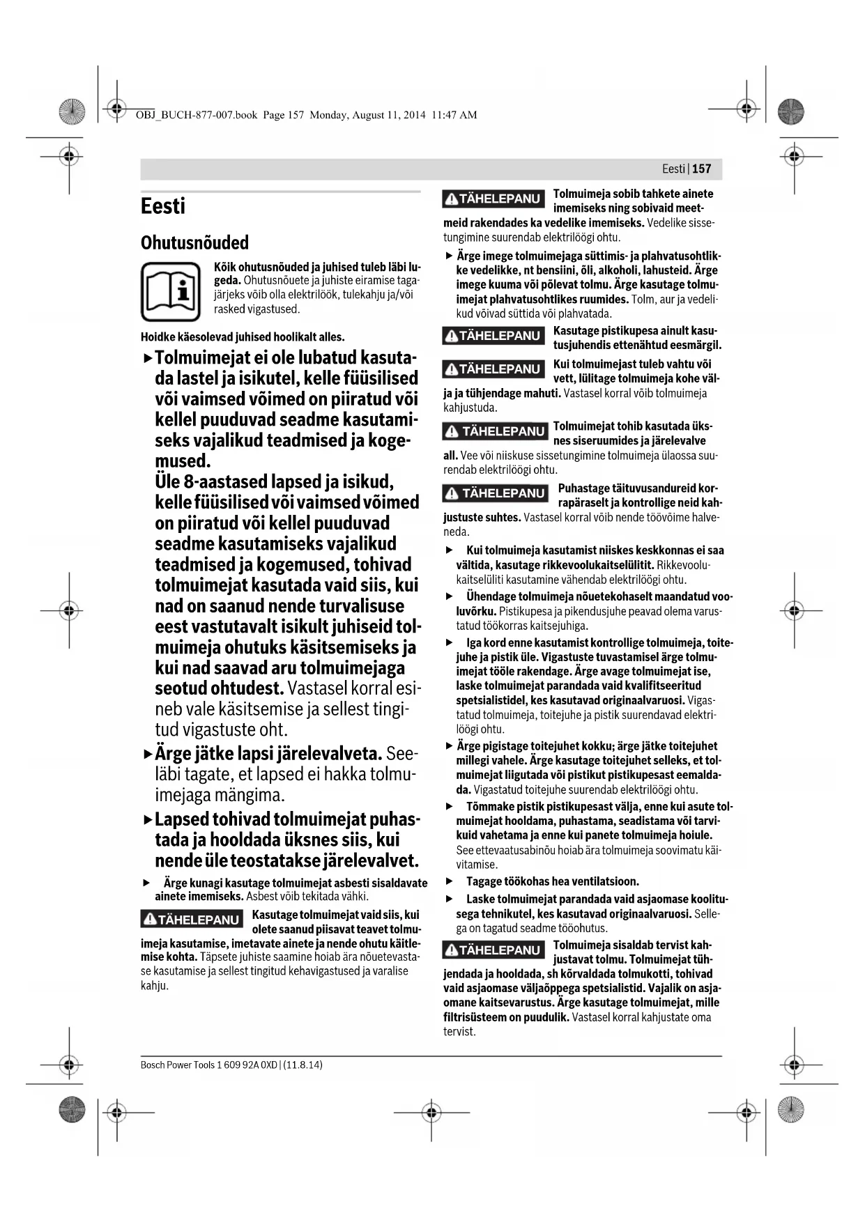 TÄHELEPANU TÄHELEPANU TÄHELEPANU TÄHELEPANU TÄHELEPANU TÄHELEPANU TÄHELEPANU OBJ_BUCH-877-007.book Page 157 Monday, August 11, 2014 11:47 AM158 | Eesti 1 609 92A 0XD | (11.8.14) Bosch Power Tools Enne töölerakendamist veenduge, et imivooliku sei-