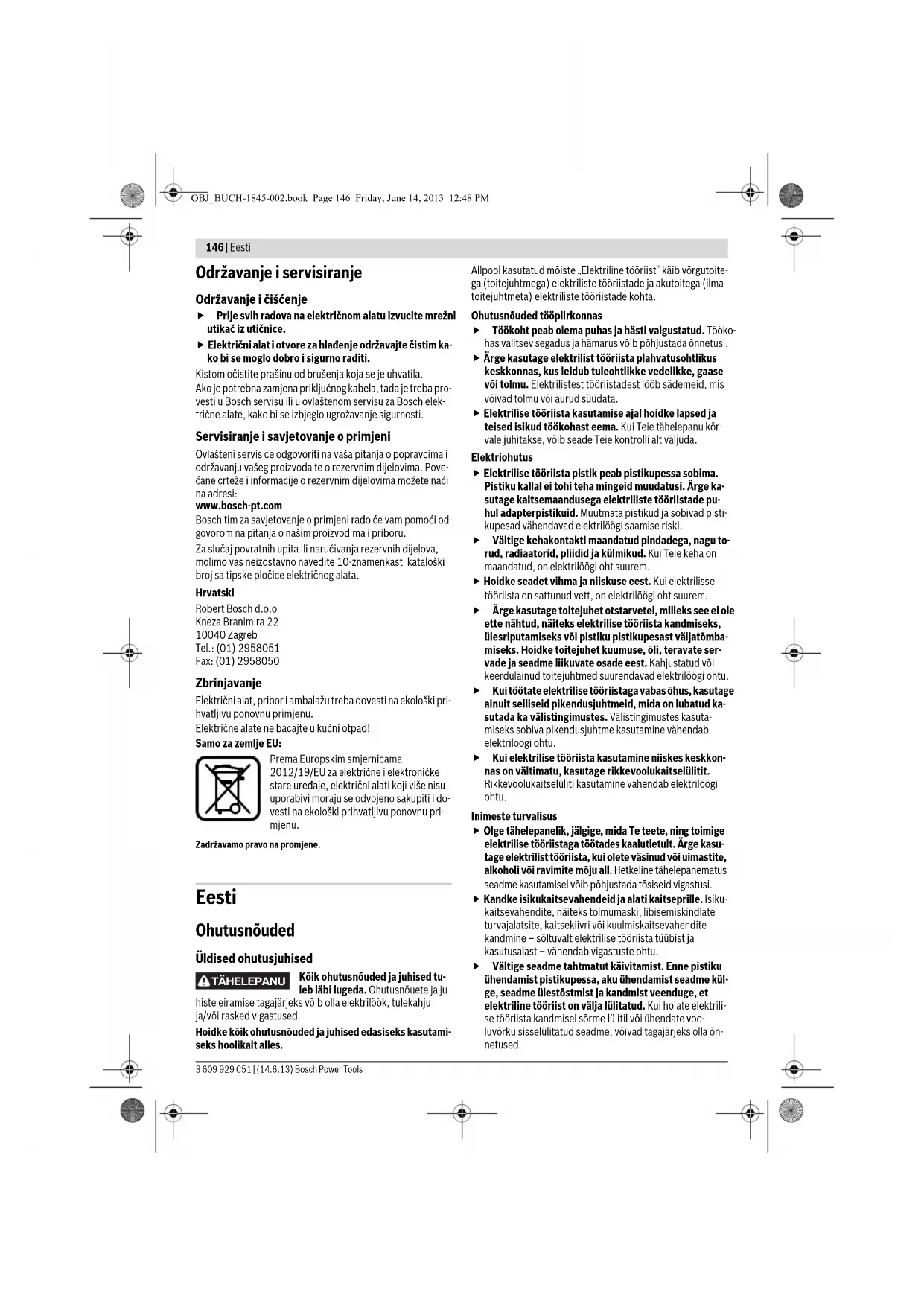 Kombinirani valjci od filzelina Za satiniranje i matiranje metalnih površina fina 120 –240 Valjci od filzelina OBJ_BUCH-1845-002.book Page 145 Friday, June 14, 2013 12:48 PM146 | Eesti 3 609 929 C51 | (14.6.13) Bosch Power Tools Održavanje i servisiranje Održavanje i čišćenje Prije svih radova na električnom alatu izvucite mrežni utikač iz utičnice. Električni alat i otvore za hlađenje održavajte čistim ka- ko bi se moglo dobro i sigurno raditi. Kistom očistite prašinu od brušenja koja se je uhvatila. Ako je potrebna zamjena priključnog kabela, tada je treba pro- vesti u Bosch servisu ili u ovlaštenom servisu za Bosch elek- trične alate, kako bi se izbjeglo ugrožavanje sigurnosti. Servisiranje i savjetovanje o primjeni Ovlašteni servis će odgovoriti na vaša pitanja o popravcima i održavanju vašeg proizvoda te o rezervnim dijelovima. Pove- ćane crteže i informacije o rezervnim dijelovima možete naći na adresi: www.bosch-pt.com Bosch tim za savjetovanje o primjeni rado će vam pomoći od- govorom na pitanja o našim proizvodima i priboru. Za slučaj povratnih upita ili naručivanja rezervnih dijelova, molimo vas neizostavno navedite 10-znamenkasti kataloški broj sa tipske pločice električnog alata. Hrvatski Robert Bosch d.o.o Kneza Branimira 22 10040 Zagreb Tel.: (01) 2958051 Fax: (01) 2958050 Zbrinjavanje Električni alat, pribor i ambalažu treba dovesti na ekološki pri- hvatljivu ponovnu primjenu. Električne alate ne bacajte u kućni otpad! Samo za zemlje EU: Prema Europskim smjernicama 2012/19/EU za električne i elektroničke stare uređaje, električni alati koji više nisu uporabivi moraju se odvojeno sakupiti i do- vesti na ekološki prihvatljivu ponovnu pri- mjenu. Zadržavamo pravo na promjene. Eesti Ohutusnõuded Üldised ohutusjuhised Kõik ohutusnõuded ja juhised tu- leb läbi lugeda. Ohutusnõuete ja ju- histe eiramise tagajärjeks võib olla elektrilöök, tulekahju ja/või rasked vigastused. Hoidke kõik ohutusnõuded ja juhised edasiseks kasutami- seks hoolikalt alles. Allpool kasutatud mõiste „Elektriline tööriist“ käib võrgutoite- ga (toitejuhtmega) elektriliste tööriistade ja akutoitega (ilma toitejuhtmeta) elektriliste tööriistade kohta. Ohutusnõuded tööpiirkonnas Töökoht peab olema puhas ja hästi valgustatud. Tööko- has valitsev segadus ja hämarus võib põhjustada õnnetusi. Ärge kasutage elektrilist tööriista plahvatusohtlikus keskkonnas, kus leidub tuleohtlikke vedelikke, gaase või tolmu. Elektrilistest tööriistadest lööb sädemeid, mis võivad tolmu või aurud süüdata. Elektrilise tööriista kasutamise ajal hoidke lapsed ja teised isikud töökohast eema. Kui Teie tähelepanu kõr- vale juhitakse, võib seade Teie kontrolli alt väljuda. Elektriohutus Elektrilise tööriista pistik peab pistikupessa sobima. Pistiku kallal ei tohi teha mingeid muudatusi. Ärge ka- sutage kaitsemaandusega elektriliste tööriistade pu- hul adapterpistikuid. Muutmata pistikud ja sobivad pisti- kupesad vähendavad elektrilöögi saamise riski. Vältige kehakontakti maandatud pindadega, nagu to- rud, radiaatorid, pliidid ja külmikud. Kui Teie keha on maandatud, on elektrilöögi oht suurem. Hoidke seadet vihma ja niiskuse eest. Kui elektrilisse tööriista on sattunud vett, on elektrilöögi oht suurem. Ärge kasutage toitejuhet otstarvetel, milleks see ei ole ette nähtud, näiteks elektrilise tööriista kandmiseks, ülesriputamiseks või pistiku pistikupesast väljatõmba- miseks. Hoidke toitejuhet kuumuse, õli, teravate ser- vade ja seadme liikuvate osade eest. Kahjustatud või keerduläinud toitejuhtmed suurendavad elektrilöögi ohtu. Kui töötate elektrilise tööriistaga vabas õhus, kasutage ainult selliseid pikendusjuhtmeid, mida on lubatud ka- sutada ka välistingimustes. Välistingimustes kasuta- miseks sobiva pikendusjuhtme kasutamine vähendab elektrilöögi ohtu. Kui elektrilise tööriista kasutamine niiskes keskkon- nas on vältimatu, kasutage rikkevoolukaitselülitit. Rikkevoolukaitselüliti kasutamine vähendab elektrilöögi ohtu. Inimeste turvalisus Olge tähelepanelik, jälgige, mida Te teete, ning toimige elektrilise tööriistaga töötades kaalutletult. Ärge kasu- tage elektrilist tööriista, kui olete väsinud või uimastite, alkoholi või ravimite mõju all. Hetkeline tähelepanematus seadme kasutamisel võib põhjustada tõsiseid vigastusi. Kandke isikukaitsevahendeid ja alati kaitseprille. Isiku- kaitsevahendite, näiteks tolmumaski, libisemiskindlate turvajalatsite, kaitsekiivri või kuulmiskaitsevahendite kandmine – sõltuvalt elektrilise tööriista tüübist ja kasutusalast – vähendab vigastuste ohtu. Vältige seadme tahtmatut käivitamist. Enne pistiku ühendamist pistikupessa, aku ühendamist seadme kül- ge, seadme ülestõstmist ja kandmist veenduge, et elektriline tööriist on välja lülitatud. Kui hoiate elektrili- se tööriista kandmisel sõrme lülitil või ühendate voo- luvõrku sisselülitatud seadme, võivad tagajärjeks olla õn- netused. TÄHELEPANU OBJ_BUCH-1845-002.book Page 146 Friday, June 14, 2013 12:48 PMEesti | 147 Bosch Power Tools 3 609 929 C51 | (14.6.13) Enne elektrilise tööriista sisselülitamist eemaldage selle küljest reguleerimis- ja mutrivõtmed. Seadme pöörleva osa küljes olev reguleerimis- või mutrivõti võib põhjustada vigastusi. Vältige ebatavalist kehaasendit. Võtke stabiilne töö- asend ja hoidke kogu aeg tasakaalu. Nii saate elektrilist tööriista ootamatutes olukordades paremini kontrollida. Kandke sobivat rõivastust. Ärge kandke laiu riideid ega ehteid. Hoidke juuksed, rõivad ja kindad seadme liiku- vatest osadest eemal. Lotendavad riided, ehted või pikad juuksed võivad sattuda seadme liikuvate osade vahele. Kui on võimalik paigaldada tolmueemaldus- ja tolmukogumisseadiseid, veenduge, et need on sead- mega ühendatud ja et neid kasutatakse õigesti. Tolmu- eemaldusseadise kasutamine vähendab tolmust põhjusta- tu