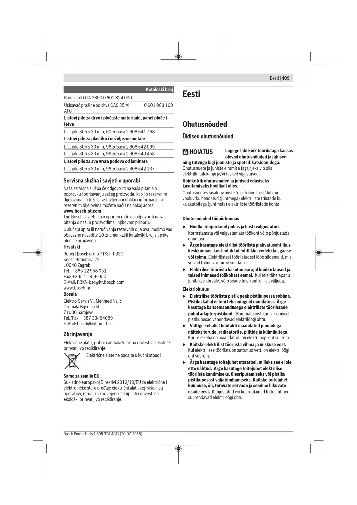 Puidutolmuimeja GAS35M AFC 0 601 9C3 100TootenumberSaekettad puidu ja plaatmaterjalide, paneelide jaliistudeleSaeketast 305 x 30 mm, 60 hammast 2 608 641 768Saekettad plastidele ja mitte-raudmetallideleSaeketast 305 x 30 mm, 96 hammast 2 608 642 099Saeketast 305 x 30 mm, 96 hammast 2 608 640 453Saekettad kõigile laminaatpõrandatüüpideleSaeketast 305 x 30 mm, 96 hammast 2 608 642 137 Klienditeenindus ja kasutusalane nõustamine Müügiesindajad annavad vastused toodete paranduse jahoolduse ning varuosadega seotud küsimustele. Joonised jainfo varuosade kohta leiate ka veebisaidilt: www.bosch-pt.comBoschi nõustajad on meeleldi abiks, kui teil on küsimusitoodete ja lisatarvikute kohta.Päringute esitamisel ja varuosade tellimisel näidake kindlastiära seadme andmesildil olev 10‑kohaline tootenumber.Eesti VabariikMercantile Group AS Boschi elektriliste käsitööriistade remont ja hooldus Pärnu mnt. 549 76401 Saue vald, Laagri Tel.: 6549 568 Faks: 679 1129 Kasutuskõlbmatuks muutunud seadmete käitlus Elektriseadmed, lisatarvikud ja pakendid tulekskeskkonnasäästlikult ringlusse võtta.Ärge visake kasutusressursi ammendanudelektrilisi tööriistu olmejäätmete hulka!Üksnes ELliikmesriikidele:Vastavalt Euroopa Parlamendi ja nõukogu direktiivile2012/19/EL elektri- ja elektroonikaseadmete jäätmetekohta ning direktiivi ülevõtvatele riiklikele õigusaktideletuleb kasutuskõlbmatuks muutunud elektrilised tööriistaderaldi kokku koguda ja keskkonnasäästlikult korduskasutadavõi ringlusse võtta. Latviešu
