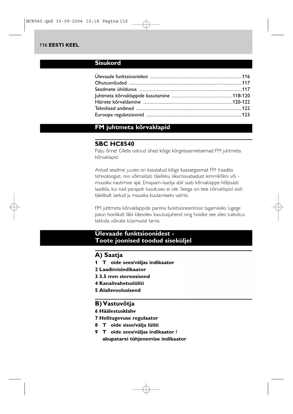 - Euroopa regulatsioonid FM juhtmeta kõrvaklapid SBC HC8540 Palju õnne! Olete ostnud ühed kõige kõrgetasemelisemad FM juhtmeta kõrvaklapid. Antud seadme juures on kasutatud kõige kaasaegsemat FM traadita tehnoloogiat, mis võimaldab täielikku liikumisvabadust lemmikfilmi või - muusika nautimise ajal. Emajaam-laadija abil saab kõrvaklappe hõlpsasti laadida, kui nad parajasti kasutuses ei ole. Seega on teie kõrvaklapid alati täielikult laetud ja muusika kuulamiseks valmis. FM juhtmeta kõrvaklappide parima funktsioneerimise tagamiseks lugege palun hoolikalt läbi käesolev kasutusjuhend ning hoidke see alles tulevikus tekkida võivate küsimuste tarvis. Ülevaade funktsioonidest - Toote joonised toodud siseküljel A) Saatja 1Toide sees/väljas indikaator 2 Laadimisindikaator 3 3.5 mm stereosisend 4 Kanalivahetuslüliti 5 Alalisvoolusisend B) Vastuvõtja 6 Häälestusklahv 7 Helitugevuse regulaator 8Toide sisse/välja lüliti 9Toide sees/väljas indikaator / akupatarei tühjenemise indikaator HC8540.qxd 15-09-2004 10:18 Pagina 116EESTI KEEL 117 Tähtis teave Palun lugege tähelepanelikult läbi järgnevad instruktsioonid ja hoidke juhend alles vajaduse korral kasutamiseks. Kõik seadme ohutust ja töötamist puudutavad juhised tuleks enne juhtmeta kõrvaklappide kasutamist läbi lugeda. Ohutusnõuded p. 123