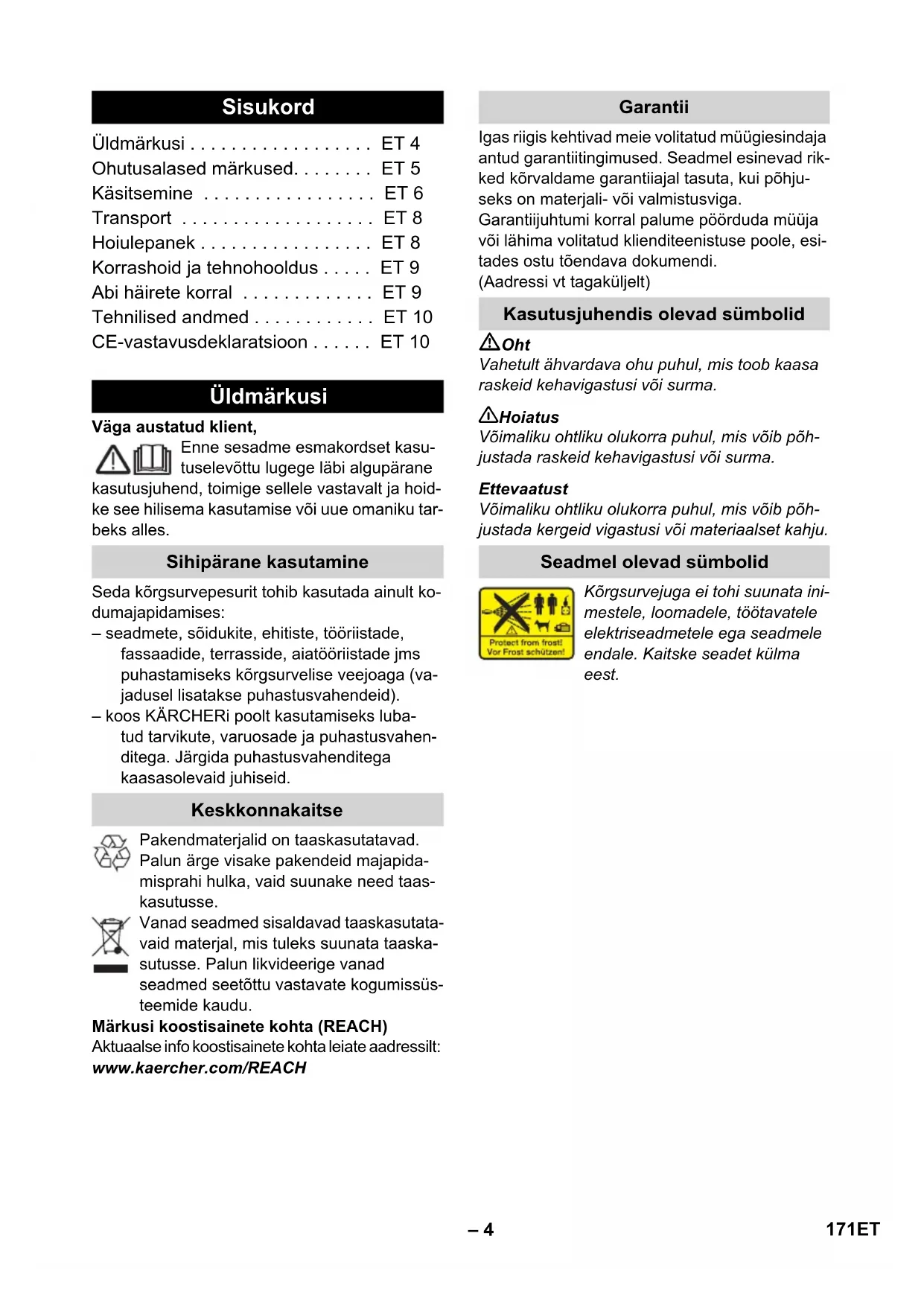 2000/14/ЕО: Приложение V ниво на шум dB(A) Измерено:86 Гарантирано:89 CEO Head of Approbation 170 BG– 4 Väga austatud klient, Enne sesadme esmakordset kasu- tuselevõttu lugege läbi algupärane kasutusjuhend, toimige sellele vastavalt ja hoid- ke see hilisema kasutamise või uue omaniku tar- beks alles. Seda kõrgsurvepesurit tohib kasutada ainult ko- dumajapidamises: – seadmete, sõidukite, ehitiste, tööriistade, fassaadide, terrasside, aiatööriistade jms puhastamiseks kõrgsurvelise veejoaga (va- jadusel lisatakse puhastusvahendeid). – koos KÄRCHERi poolt kasutamiseks luba- tud tarvikute, varuosade ja puhastusvahen- ditega. Järgida puhastusvahenditega kaasasolevaid juhiseid. Pakendmaterjalid on taaskasutatavad. Palun ärge visake pakendeid majapida- misprahi hulka, vaid suunake need taas- kasutusse. Vanad seadmed sisaldavad taaskasutata- vaid materjal, mis tuleks suunata taaska- sutusse. Palun likvideerige vanad seadmed seetõttu vastavate kogumissüs- teemide kaudu. Märkusi koostisainete kohta (REACH) Aktuaalse info koostisainete kohta leiate aadressilt: www.kaercher.com/REACH Igas riigis kehtivad meie volitatud müügiesindaja antud garantiitingimused. Seadmel esinevad rik- ked kõrvaldame garantiiajal tasuta, kui põhju- seks on materjali- või valmistusviga. Garantiijuhtumi korral palume pöörduda müüja või lähima volitatud klienditeenistuse poole, esi- tades ostu tõendava dokumendi. (Aadressi vt tagaküljelt) Oht Vahetult ähvardava ohu puhul, mis toob kaasa raskeid kehavigastusi või surma. 몇 Hoiatus Võimaliku ohtliku olukorra puhul, mis võib põh- justada raskeid kehavigastusi või surma. Ettevaatust Võimaliku ohtliku olukorra puhul, mis võib põh- justada kergeid vigastusi või materiaalset kahju. Kõrgsurvejuga ei tohi suunata ini- mestele, loomadele, töötavatele elektriseadmetele ega seadmele endale. Kaitske seadet külma eest. Sisukord Üldmärkusi . . . . . . . . . . . . . . . . . . ET 4 Ohutusalased märkused. . . . . . . . ET 5 Käsitsemine . . . . . . . . . . . . . . . . . ET 6 Transport . . . . . . . . . . . . . . . . . . . ET 8 Hoiulepanek . . . . . . . . . . . . . . . . . ET 8 Korrashoid ja tehnohooldus . . . . . ET 9 Abi häirete korral . . . . . . . . . . . . . ET 9 Tehnilised andmed . . . . . . . . . . . . ET 10 CE-vastavusdeklaratsioon . . . . . . ET 10 Üldmärkusi Sihipärane kasutamine Keskkonnakaitse Garantii Kasutusjuhendis olevad sümbolid Seadmel olevad sümbolid 171ET– 5 Oht Võrgupistikut ega pistikupesa ei tohi kunagi puutuda niiskete kätega. Seadet ei tohi käivitada, kui toitejuhe või sead- me olulised osad nagu kõrgsurvevoolik, pesu- püstol või ohutusseadised on kahjustatud. Enne igakordset kasutamist tuleb kontrolli- da, et võrgupistikuga toitekaabel oleks kah- justusteta. Defektne toitekaabel tuleb lasta viivitamatult volitatud klienditeeninduses/ elektrikul välja vahetada. Enne igakordset kasutamist tuleb kantrolli- da, et kõrsurvevoolik oleks terve. Kahjusta- tud kõrgsurvevoolik kohe välja vahetada. Plahvatusohtlikes piirkondades kasutamine on keelatud. Seadme kasutamisel ohtlikes piirkondades (nt tanklates) tuleb järgida asjakohaseid ohutuseeskirju. Kõrgsurveline veejuga võib mittesihipärasel kasutamisel ohtlik olla. Veejuga ei tohi suu- nata inimestele, loomadele, pingestatud elektriseadmetele ega seadmele endale. Kõrgsurvejuga ei tohi suunata teistele ini- mestele ega iseendale, et puhastada riideid või jalanõusid. Mitte pritsida esemeid, mis sisaldavad tervi- sele ohtlikke materjale (nt asbesti). Kõrgsurveline veejuga võib kahjustada või purustada sõidukite rehvid/rehviventiilid. Selle ohu esimeseks tundemärgiks on rehvi värvuse muutus. Vigastatud sõiduki rehvid/ rehviventiilid on eluohtlikud. Puhastamisel peab vahekaugus olema vähemalt 30 cm! Plahvatusoht! Ärge piserdage põlevaid vedelikke. Mitte kunagi ei tohi seadmesse imeda lahus- teid sisaldavat vedelikku või lahjendamata happeid ja lahusteid! Selliste ainete hulka kuuluvad nt bensiin, värvivedeldi ja kütteõli. Pihustumisel tekkiv udu on eriti tuleohtlik, plahvatusohtlik ja mürgine. Mitte kasutada atsetooni, lahjendamata happeid ja lahus- teid, sest need söövitavad seadmes kasuta- tud materjale. 몇 Hoiatus Toitepistik ja pikenduskaabli ühendus pea- vad olema veekindlad ega tohi lebada vees. Ebasobivad pikendusjuhtmed võivad olla ohtlikud. Välistingimustes võib kasutada ai- nult väljas kasutamiseks lubatud ja vastavalt tähistatud piisava ristlõikepinnaga pikendus- juhtmeid: