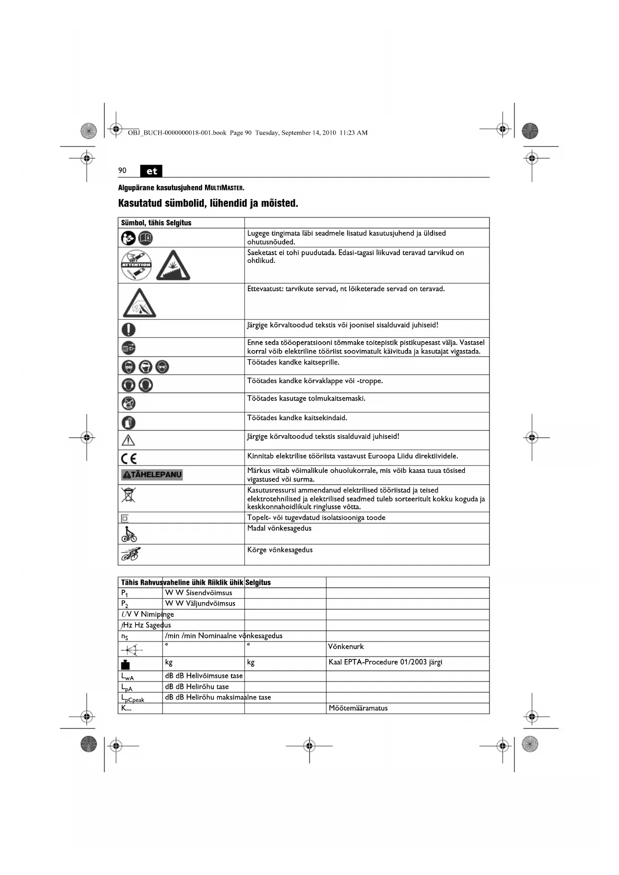 Algupärane kasutusjuhend MULTIMASTER. Kasutatud sümbolid, lühendid ja mõisted. Sümbol, tähis Selgitus Lugege tingimata läbi seadmele lisatud kasutusjuhend ja üldised ohutusnõuded. Saeketast ei tohi puudutada. Edasi-tagasi liikuvad teravad tarvikud on ohtlikud. Ettevaatust: tarvikute servad, nt lõiketerade servad on teravad. Järgige kõrvaltoodud tekstis või joonisel sisalduvaid juhiseid! Enne seda tööoperatsiooni tõmmake toitepistik pistikupesast välja. Vastasel korral võib elektriline tööriist soovimatult käivituda ja kasutajat vigastada. Töötades kandke kaitseprille. Töötades kandke kõrvaklappe või -troppe. Töötades kasutage tolmukaitsemaski. Töötades kandke kaitsekindaid. Järgige kõrvaltoodud tekstis sisalduvaid juhiseid! Kinnitab elektrilise tööriista vastavust Euroopa Liidu direktiividele. Märkus viitab võimalikule ohuolukorrale, mis võib kaasa tuua tõsised vigastused või surma. Kasutusressursi ammendanud elektrilised tööriistad ja teised elektrotehnilised ja elektrilised seadmed tuleb sorteeritult kokku koguda ja keskkonnahoidlikult ringlusse võtta. Topelt- või tugevdatud isolatsiooniga toode Madal võnkesagedus Kõrge võnkesagedus Tähis Rahvusvaheline ühik Riiklik ühik Selgitus