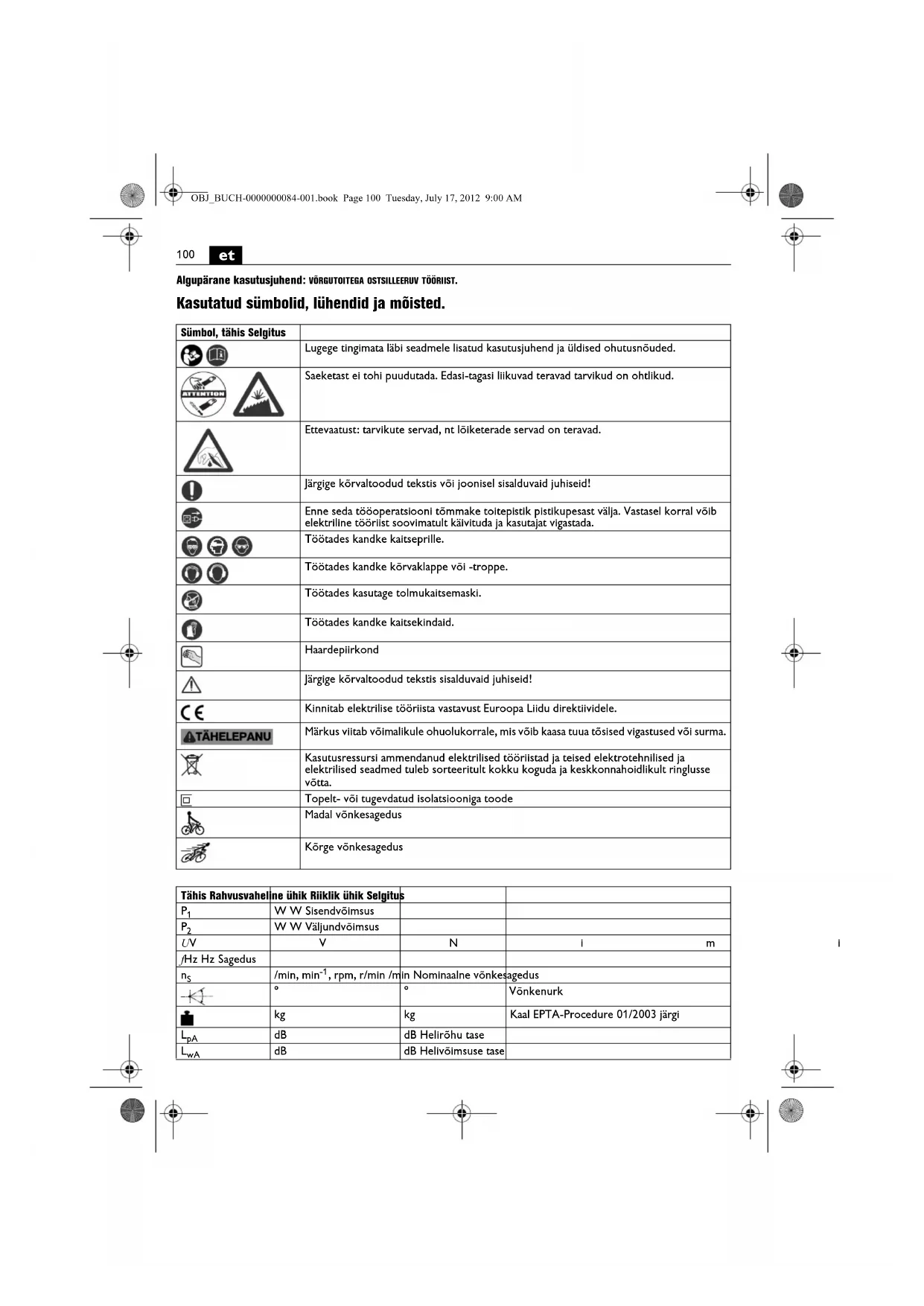 Toodud vibrssoonitase kehtib tooriista kasutamisel ettenahtud odstarbel. Kui aga elektrilist tooriista kasutatakse muudeks toodeks, rakendatakse teisi tarvikud voi kui tooriista hooldus pole piisav, voib vibrssoonitase kokiuda. See voib vibrslooni tokoguperioodi jooksul tunduvalt surendada.