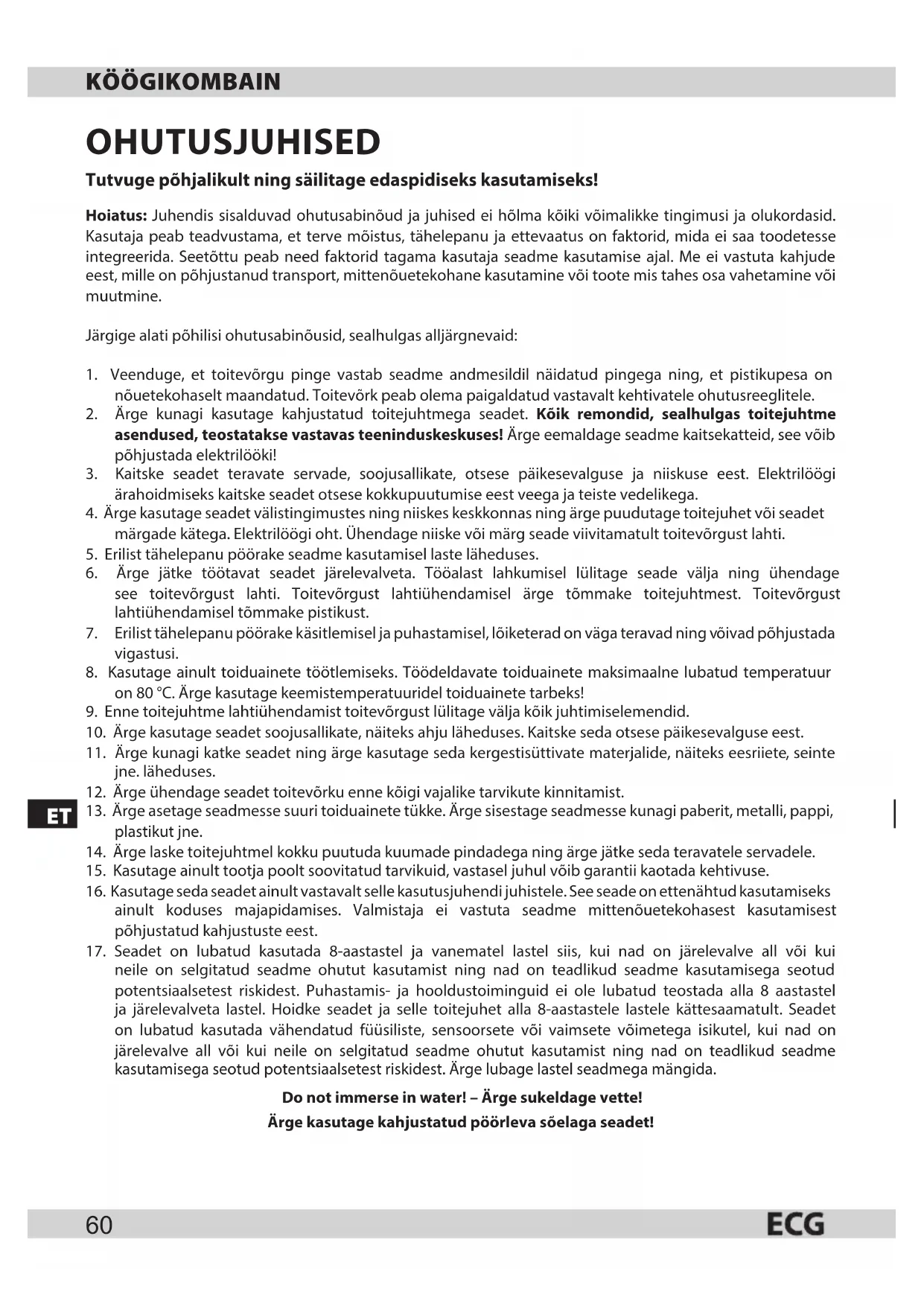 neile on selgitatud seadme ohutut kasutamist ning nad on teadlikud seadme kasutamisega seotud potentsiaalsetest riskidest. Puhastamis- ja hooldustoiminguid ei ole lubatud teostada alla 8 aastastel ja järelevalveta lastel. Hoidke seadet ja selle toitejuhet alla 8-aastastele lastele kättesaamatult. Seadet on lubatud kasutada vähendatud füüsiliste, sensoorsete või vaimsete võimetega isikutel, kui nad on järelevalve all või kui neile on selgitatud seadme ohutut kasutamist ning nad on teadlikud seadme kasutamisega seotud potentsiaalsetest riskidest. Ärge lubage lastel seadmega mängida. Do not immerse in water! – Ärge sukeldage vette! Ärge kasutage kahjustatud pöörleva sõelaga seadet!61