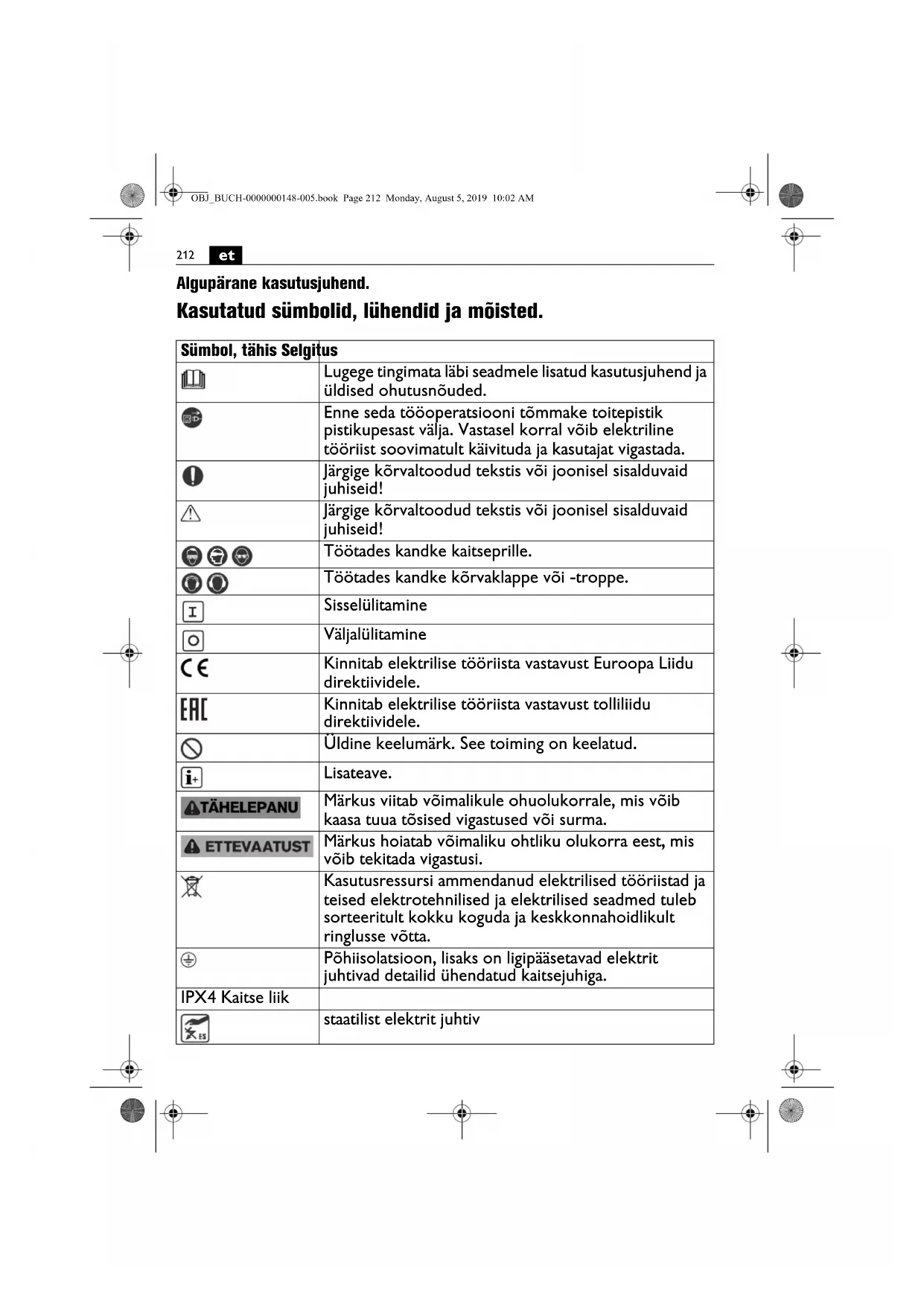 Algupärane kasutusjuhend. Kasutatud sümbolid, lühendid ja mõisted. Sümbol, tähis Selgitus Lugege tingimata läbi seadmele lisatud kasutusjuhend ja üldised ohutusnõuded. Enne seda tööoperatsiooni tõmmake toitepistik pistikupesast välja. Vastasel korral võib elektriline tööriist soovimatult käivituda ja kasutajat vigastada. Järgige kõrvaltoodud tekstis või joonisel sisalduvaid juhiseid! Järgige kõrvaltoodud tekstis või joonisel sisalduvaid juhiseid! Töötades kandke kaitseprille. Töötades kandke kõrvaklappe või -troppe. Sisselülitamine Väljalülitamine Kinnitab elektrilise tööriista vastavust Euroopa Liidu direktiividele. Kinnitab elektrilise tööriista vastavust tolliliidu direktiividele. Üldine keelumärk. See toiming on keelatud. Lisateave. Märkus viitab võimalikule ohuolukorrale, mis võib kaasa tuua tõsised vigastused või surma. Märkus hoiatab võimaliku ohtliku olukorra eest, mis võib tekitada vigastusi. Kasutusressursi ammendanud elektrilised tööriistad ja teised elektrotehnilised ja elektrilised seadmed tuleb sorteeritult kokku koguda ja keskkonnahoidlikult ringlusse võtta. Põhiisolatsioon, lisaks on ligipääsetavad elektrit juhtivad detailid ühendatud kaitsejuhiga. IPX4 Kaitse liik staatilist elektrit juhtiv OBJ_BUCH-0000000148-005.book Page 212 Monday, August 5, 2019 10:02 AM213