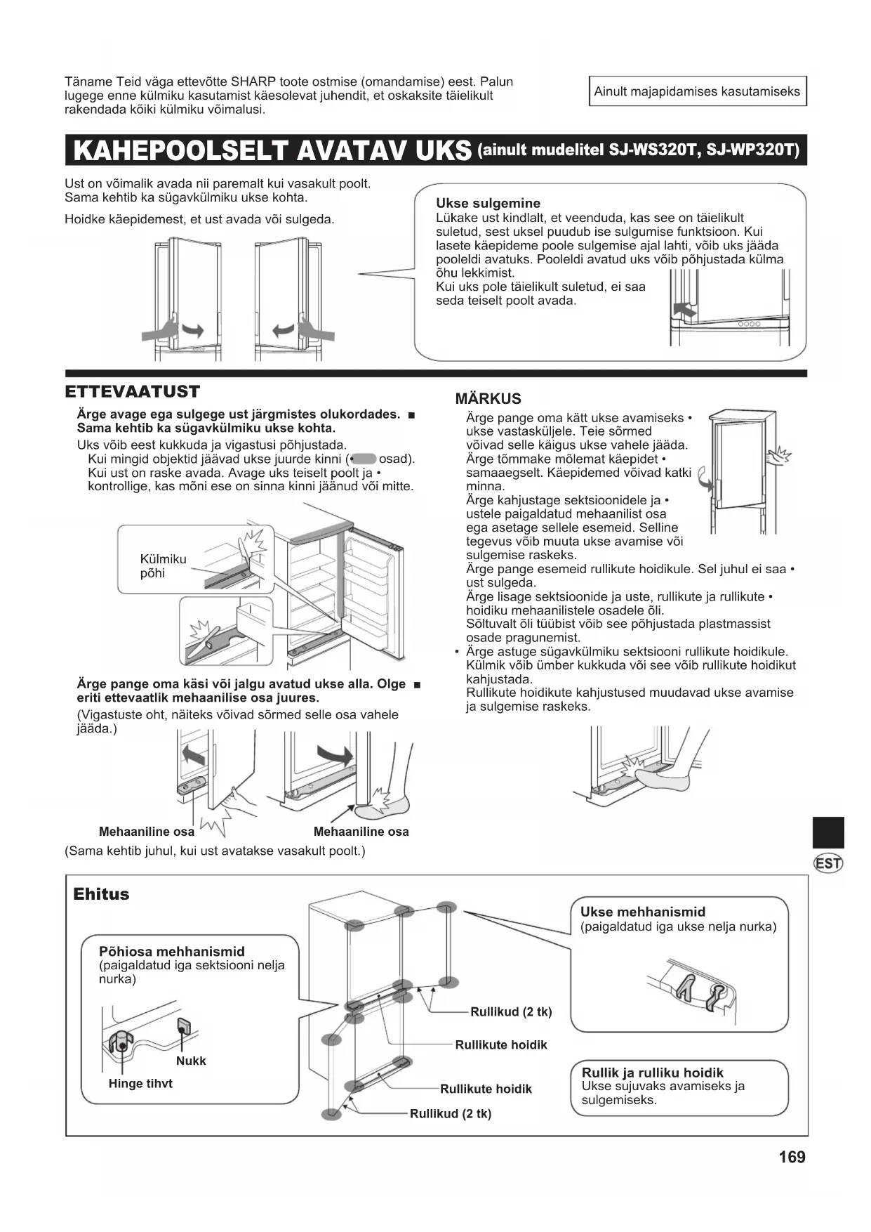 (ainult mudelitel SJ-WS320T, SJ-WP320T) Ust on võimalik avada nii paremalt kui vasakult poolt.Sama kehtib ka sügavkülmiku ukse kohta.Hoidke käepidemest, et ust avada või sulgeda. Ukse sulgemine Lükake ust kindlalt, et veenduda, kas see on täielikult suletud, sest uksel puudub ise sulgumise funktsioon. Kui lasete käepideme poole sulgemise ajal lahti, võib uks jääda pooleldi avatuks. Pooleldi avatud uks võib põhjustada külma õhu lekkimist. Kui uks pole täielikult suletud, ei saa seda teiselt poolt avada.(Sama kehtib juhul, kui ust avatakse vasakult poolt.) Põhiosa mehhanismid (paigaldatud iga sektsiooni nelja nurka)Rullikute hoidikRullikud (2 tk)Rullikud (2 tk)Rullikute hoidik Ukse mehhanismid (paigaldatud iga ukse nelja nurka) Rullik ja rulliku hoidik Ukse sujuvaks avamiseks ja sulgemiseks.Täname Teid väga ettevõtte SHARP toote ostmise (omandamise) eest. Palun lugege enne külmiku kasutamist käesolevat juhendit, et oskaksite täielikult rakendada kõiki külmiku võimalusi.Külmiku põhi Mehaaniline osa Nukk Hinge tihvtMehaaniline osa(B107)_BOOK-E.indb 169 2010/09/28 16:29:31170 Külmik sisaldab kergestisüttivat jahutusvedelikku (R600a ■ isobutaan) ja isoleeritult ringlevat gaasi (tsüklobutaan). Järgige süttimise ja plahvatuse vältimiseks järgmisi eeskirju. Külmiku taga ja sees paiknev jahutussüsteem sisaldab • jahutusvedelikku. Vältige teravate objektide puutumist vastu jahutussüsteemi. Ärge kasutage sulatamisprotsessi kiirendamiseks • mehaanilisi seadmeid ega muid vahendeid. (Selles külmikus kasutatakse automaatset sulatussüsteemi.) Ärge kasutage külmiku sees elektriseadmeid.• Kasuta külmiku sektsiooni sisemise tule jaoks vaid • spetsiaalseid osi. Ärge blokeerige ventilatsiooniavasid külmiku ümbruses.• Ärge kasutage külmiku lähedal tuleohtlikke pihusteid, nt • pihustatavaid värve. Need võivad põhjustada plahvatuse või tulekahju. Jahutussüsteemi lõhkemise korral ärge puudutage • seinakontakti ega kasutage lahtist tuld. Avage aken ja tuulutage ruumi. Pöörduge seejärel ettevõtte SHARP volitatud teeninduskeskusesse. Külmik tuleb kõrvaldada nõuetekohaselt. Viige külmik • ümbertöötlemistehasesse tuleohtliku jahutusvedeliku ja isolatsioonigaaside ümbertöötlemiseks. Ärge hoidke külmikus lenduvaid ja kergestisüttivaid aineid ■ (eeter, bensiin, propaan, kleepained, absoluutne alkohol jms). Need ained võivad plahvatada. Toitepistikule kogunev tolm võib tekitada tuleohtu. Pühkige ■ pistik hoolikalt tolmust puhtaks. Ärge proovige külmikut ümber ehitada või selle detaile ■ lahti võtta. See võib põhjustada tuleohtu, elektrilööke või kehavigastusi. Külmiku kõrvaldamiseks hoiustamisel hoolitsege, et see ■ ei oleks ohtlik lastele (nt eemaldage laste lõksu jäämise vältimiseks magnetilised ukseulgurid). ETTEVAATUST TÄHELEPANU Ärge katsuge kompressorisõlme või selle ümber ■ paiknevaid alasid, kuna töö ajal muutuvad nad äärmiselt kuumaks ning nende metallservad võivad tekitada vigastusi. Ärge puudutage märgade kätega sügavkülmiku ■ sektsioonis asuvaid toiduaineid või metallkonteinereid. See võib põhjustada külmakahjustust. Ärge kasutage pikendusjuhet ega adapterpistikut. ■ Ärge asetage sügavkülmikusse pudeli- ega purgijooke, ■ kuna need võivad külmumisel puruneda. Veenduge, et toitejuhe ei ole paigaldamise või ■ teisaldamise käigus kahjustada saanud. Ärge ühendage pistikut, kui toitepistik või –juhe on lahti. See võib põhjustada elektrilöögi või tulekahju. Külmiku toite katkestamiseks eemaldage toitepistik ■ pistikupesast. Ärge sikutage toitejuhet. See võib põhjustada elektrilööke või tuleohtu. Kui painduv toitekaabel saab vigastada, peab selle ■ välja vahetama ettevõtte SHARP poolt tunnustatud hooldustehnik, kuna asendamiseks tuleb kasutada spetsiaalset kaablit. Kui külmikust lekib gaasi, avage aken, õhutage ruumi jne. ■ Ärge katsuge külmikut ega toiteplokki. Ärge asetage külmikule vedelikku sisaldavaid või ■ ebakindlaid esemeid. Külmikut ei tohiks kasutada füüsiliste, vaimsete või ■ meelepuuetega, aga ka väheste kogemuste või teadmistega inimesed (sh lapsed), ilma järelvalveta või eelneva juhendamiseta selle kasutamise kohta, nende ohutuse eest vastutava isiku poolt. Täiskasvanud peaks jälgima, et lapsed ei mängiks külmikuga. Kasutajainfo seadmete äraviskamise kohta (eramajapidamistele)