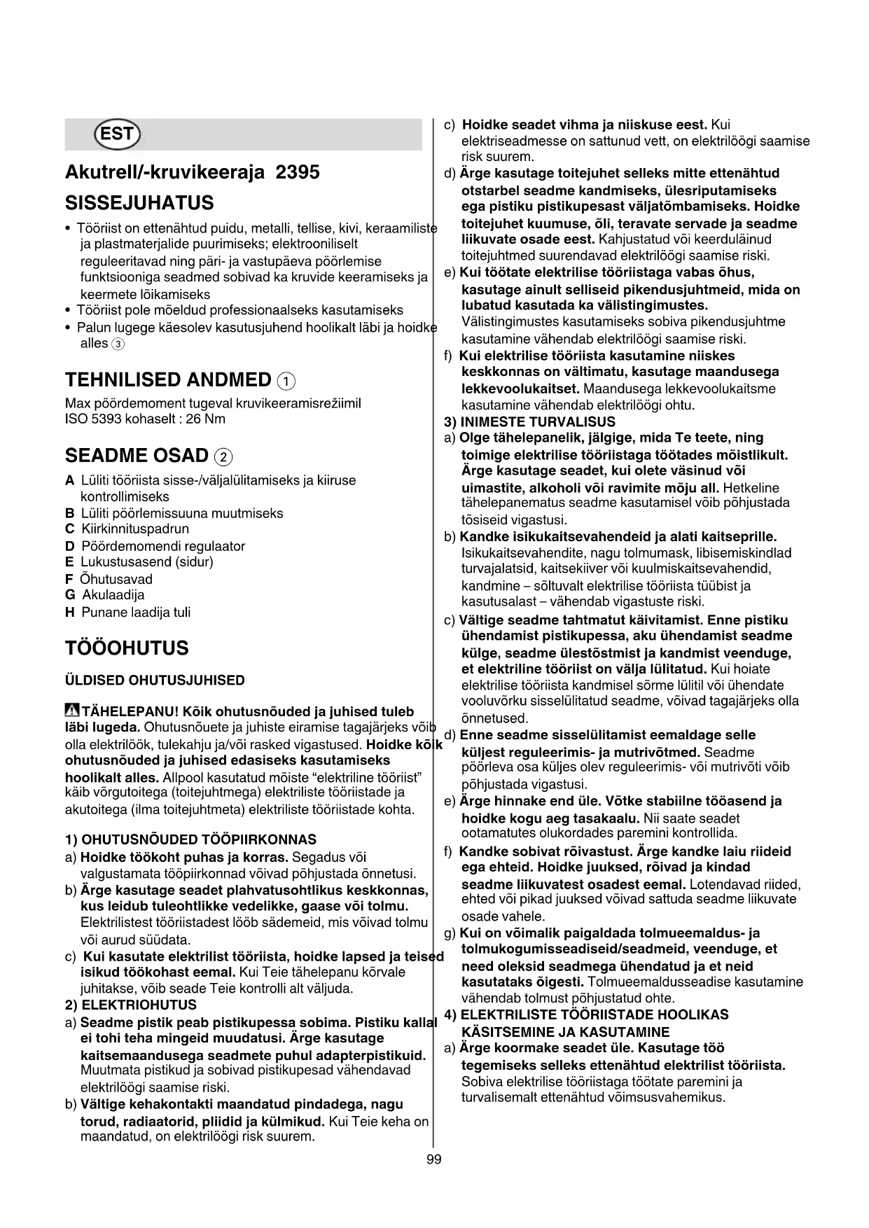 - Palun lugege käesolev kasutusjuhend hoolikalt läbi ja hoidke alles 3 TEHNILISED ANDMED 1 Max pöördemoment tugeval kruvikeeramisrežiimil ISO 5393 kohaselt : 26 Nm SEADME OSAD 2 A Lüliti tööriista sisse-/väljalülitamiseks ja kiiruse kontrollimiseks B Lüliti pöörlemissuuna muutmiseks C Kiirkinnituspadrun D Pöördemomendi regulaator E Lukustusasend (sidur) F Õhutusavad G Akulaadija H Punane laadija tuli TÖÖOHUTUS ÜLDISED OHUTUSJUHISED TÄHELEPANU! Kõik ohutusnõuded ja juhised tuleb läbi lugeda. Ohutusnõuete ja juhiste eiramise tagajärjeks võib olla elektrilöök, tulekahju ja/või rasked vigastused. Hoidke kõik ohutusnõuded ja juhised edasiseks kasutamiseks hoolikalt alles. Allpool kasutatud mõiste “elektriline tööriist” käib võrgutoitega (toitejuhtmega) elektriliste tööriistade ja akutoitega (ilma toitejuhtmeta) elektriliste tööriistade kohta.