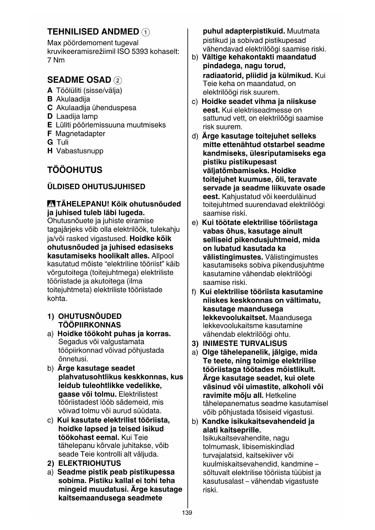 - Palun lugege käesolev kasutusjuhend hoolikalt läbi ja hoidke alles 3139 TEHNILISED ANDMED 1 Max pöördemoment tugeval kruvikeeramisrežiimil ISO 5393 kohaselt: 7 Nm SEADME OSAD 2 A Töölüliti (sisse/välja) B Akulaadija C Akulaadija ühenduspesa D Laadija lamp E Lüliti pöörlemissuuna muutmiseks F Magnetadapter G Tuli H Vabastusnupp TÖÖOHUTUS ÜLDISED OHUTUSJUHISED TÄHELEPANU! Kõik ohutusnõuded ja juhised tuleb läbi lugeda. Ohutusnõuete ja juhiste eiramise tagajärjeks võib olla elektrilöök, tulekahju ja/või rasked vigastused. Hoidke kõik ohutusnõuded ja juhised edasiseks kasutamiseks hoolikalt alles. Allpool kasutatud mõiste “elektriline tööriist” käib võrgutoitega (toitejuhtmega) elektriliste tööriistade ja akutoitega (ilma toitejuhtmeta) elektriliste tööriistade kohta.