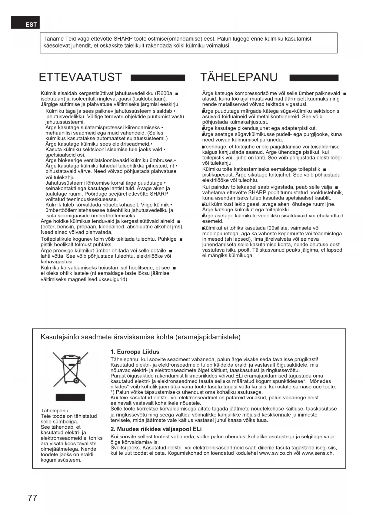 ETTEVAATUST TÄHELEPANU Ärge katsuge kompressorisõlme või selle ümber paiknevaid ■alasid, kuna töö ajal muutuvad nad äärmiselt kuumaks ning nende metallservad võivad tekitada vigastusi.Ärge puudutage märgade kätega sügavkülmiku sektsioonis ■asuvaid toiduaineid või metallkonteinereid. See võib põhjustada külmakahjustust.Ärge kasutage pikendusjuhet ega adapterpistikut. ■Ärge asetage sügavkülmikusse pudeli- ega purgijooke, kuna ■need võivad külmumisel puruneda.Veenduge, et toitejuhe ei ole paigaldamise või teisaldamise ■käigus kahjustada saanud. Ärge ühendage pistikut, kui toitepistik või –juhe on lahti. See võib põhjustada elektrilöögi või tulekahju.Külmiku toite katkestamiseks eemaldage toitepistik ■pistikupesast. Ärge sikutage toitejuhet. See võib põhjustada elektrilööke või tuleohtu. Kui painduv toitekaabel saab vigastada, peab selle välja ■vahetama ettevõtte SHARP poolt tunnustatud hooldustehnik, kuna asendamiseks tuleb kasutada spetsiaalset kaablit.Kui külmikust lekib gaasi, avage aken, õhutage ruumi jne. ■Ärge katsuge külmikut ega toiteplokki.Ärge asetage külmikule vedelikku sisaldavaid või ebakindlaid ■esemeid.Külmikut ei tohiks kasutada füüsiliste, vaimsete või ■meelepuuetega, aga ka väheste kogemuste või teadmistega inimesed (sh lapsed), ilma järelvalveta või eelneva juhendamiseta selle kasutamise kohta, nende ohutuse eest vastutava isiku poolt. Täiskasvanud peaks jälgima, et lapsed ei mängiks külmikuga. Kasutajainfo seadmete äraviskamise kohta (eramajapidamistele)