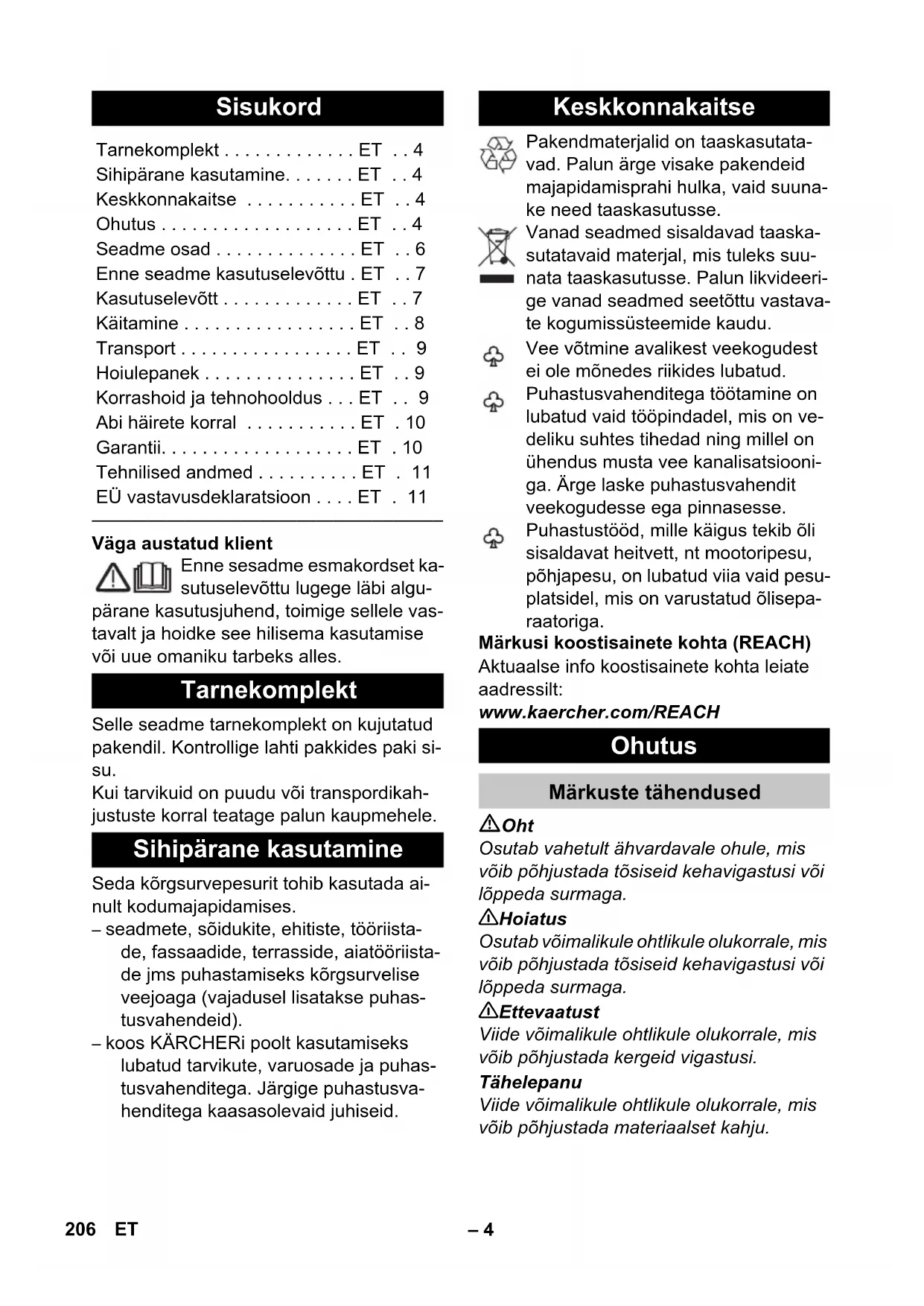 Väga austatud klient Enne sesadme esmakordset ka- sutuselevõttu lugege läbi algu- pärane kasutusjuhend, toimige sellele vas- tavalt ja hoidke see hilisema kasutamise või uue omaniku tarbeks alles. Selle seadme tarnekomplekt on kujutatud pakendil. Kontrollige lahti pakkides paki si- su. Kui tarvikuid on puudu või transpordikah- justuste korral teatage palun kaupmehele. Seda kõrgsurvepesurit tohib kasutada ai- nult kodumajapidamises. – seadmete, sõidukite, ehitiste, tööriista- de, fassaadide, terrasside, aiatööriista- de jms puhastamiseks kõrgsurvelise veejoaga (vajadusel lisatakse puhas- tusvahendeid). – koos KÄRCHERi poolt kasutamiseks lubatud tarvikute, varuosade ja puhas- tusvahenditega. Järgige puhastusva- henditega kaasasolevaid juhiseid. Pakendmaterjalid on taaskasutata- vad. Palun ärge visake pakendeid majapidamisprahi hulka, vaid suuna- ke need taaskasutusse. Vanad seadmed sisaldavad taaska- sutatavaid materjal, mis tuleks suu- nata taaskasutusse. Palun likvideeri- ge vanad seadmed seetõttu vastava- te kogumissüsteemide kaudu. Vee võtmine avalikest veekogudest ei ole mõnedes riikides lubatud. Puhastusvahenditega töötamine on lubatud vaid tööpindadel, mis on ve- deliku suhtes tihedad ning millel on ühendus musta vee kanalisatsiooni- ga. Ärge laske puhastusvahendit veekogudesse ega pinnasesse. Puhastustööd, mille käigus tekib õli sisaldavat heitvett, nt mootoripesu, põhjapesu, on lubatud viia vaid pesu- platsidel, mis on varustatud õlisepa- raatoriga. Märkusi koostisainete kohta (REACH) Aktuaalse info koostisainete kohta leiate aadressilt: www.kaercher.com/REACH Oht Osutab vahetult ähvardavale ohule, mis võib põhjustada tõsiseid kehavigastusi või lõppeda surmaga. 몇 Hoiatus Osutab võimalikule ohtlikule olukorrale, mis võib põhjustada tõsiseid kehavigastusi või lõppeda surmaga. 몇 Ettevaatust Viide võimalikule ohtlikule olukorrale, mis võib põhjustada kergeid vigastusi. Tähelepanu Viide võimalikule ohtlikule olukorrale, mis võib põhjustada materiaalset kahju. Sisukord Tarnekomplekt . . . . . . . . . . . . . ET . . 4 Sihipärane kasutamine. . . . . . . ET . . 4 Keskkonnakaitse . . . . . . . . . . . ET . . 4 Ohutus . . . . . . . . . . . . . . . . . . . ET . . 4 Seadme osad . . . . . . . . . . . . . . ET . . 6 Enne seadme kasutuselevõttu . ET . . 7 Kasutuselevõtt . . . . . . . . . . . . . ET . . 7 Käitamine . . . . . . . . . . . . . . . . . ET . . 8 Transport . . . . . . . . . . . . . . . . . ET . . 9 Hoiulepanek . . . . . . . . . . . . . . . ET . . 9 Korrashoid ja tehnohooldus . . . ET . . 9 Abi häirete korral . . . . . . . . . . . ET . 10 Garantii. . . . . . . . . . . . . . . . . . . ET . 10 Tehnilised andmed . . . . . . . . . . ET . 11 EÜ vastavusdeklaratsioon . . . . ET . 11 Tarnekomplekt Sihipärane kasutamine Keskkonnakaitse Ohutus Märkuste tähendused 206 ET– 5 Kõrgsurvejuga ei tohi suunata inimestele, loomadele, tööta- vatele elektriseadmetele ega seadmele endale. Kaitske seadet külma eest. Seadet ei ole lubatud ühendada vahetult avalikku veevärki. Oht Ärge kunagi puudutage võrgupistikut ja pistikupesa märgade kätega. Enne igakordset kasutamist tuleb kont- rollida, et võrgupistikuga toitejuhe oleks kahjustusteta. Kahjustatud toitekaabel lasta viivitamatult volitatud hooldustöö- kojal/elektrikul välja vahetada. Kui toite- kaabel on defektne, ei tohi seadet kasu- tada. Kõik töötamispiirkonnas asuvad pin- gestatud detailid peavad olema veeju- gade eest kaitstud. Pikenduskaabli toitepistik ja pistmik pea- vad olema veekindlad ning ei tohi paikne- da vees. Pistmik ei tohi ka põrandal olla. Soovitame kasutada kaablitrumleid, mis tagavad, et pistikupesad on vähemalt 60 mm põrandast kõrgemal. Jälgige, et toitejuhet või pikendusjuhet ei kahjustataks sellest ülesõitmisega, muljumisega, rebimisega ega muul vii- sil. Toitejuhtmed peavad olema kaitstud kuumuse, õli ja teravate servade eest. 몇 Hoiatus Seadet tohib ühendada ainult vahelduv- voolutoitega. Pinge peab vastama seadme tüübisildil esitatud pingele. Seadet tohib ühendada ainult pistiku- pessa, mis on elektrimontööri poolt pai- galdatud vastavalt standardile IEC 60364. Mittesobivad elektrilised pikendusjuht- med võivad olla ohtlikud. Välistingimus- tes võib kasutada ainult väljas kasuta- miseks lubatud ja vastavalt tähistatud piisava ristlõikepinnaga elektrilisi piken- dusjuhtmeid: 1 - 10 m: 1,5 mm