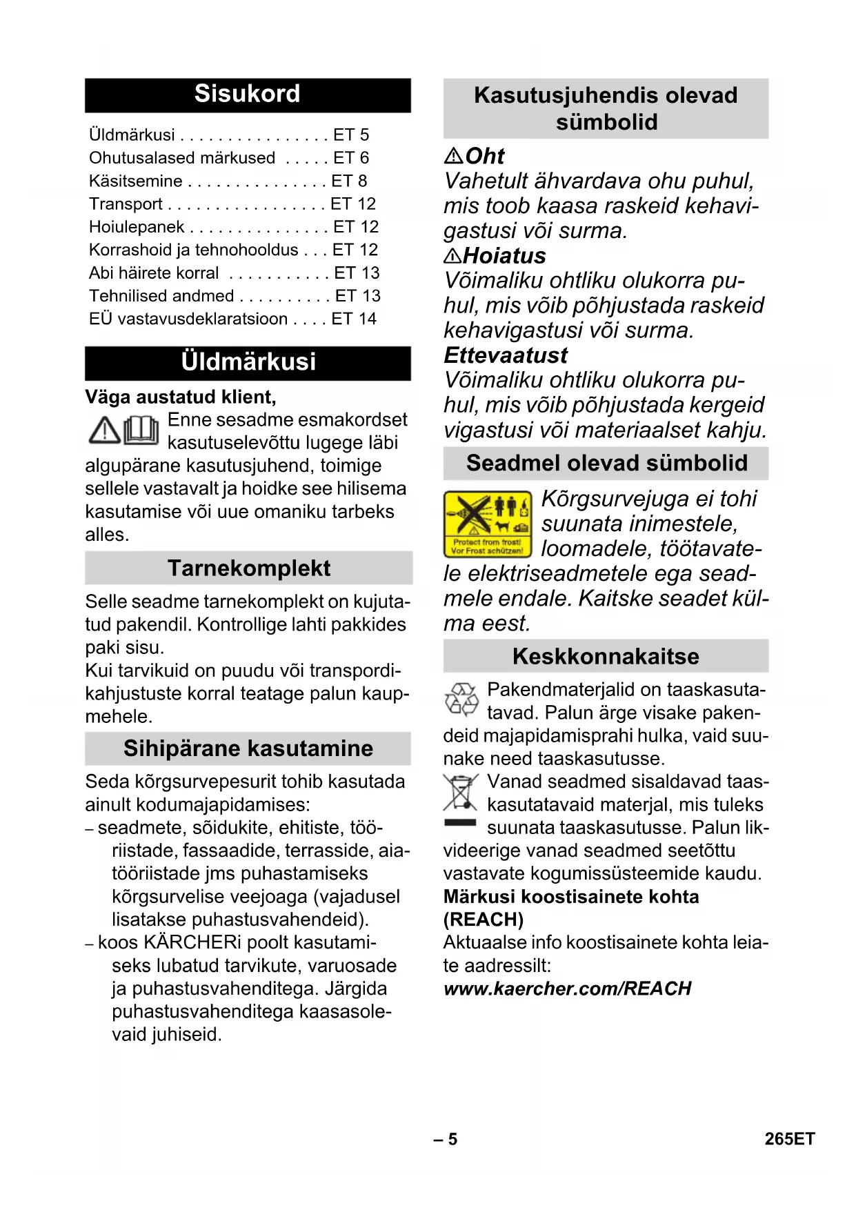 EN 61000–3–3: 2008 EN 62233: 2008 Приложен метод за оценка на съответствието: 2000/14/ЕО: Приложение V ниво на шум dB(A) Измерено:87 Гарантирано:90 Winnenden, 2013/07/01 CEO Head of Approbation 264 BG– 5 Väga austatud klient, Enne sesadme esmakordset kasutuselevõttu lugege läbi algupärane kasutusjuhend, toimige sellele vastavalt ja hoidke see hilisema kasutamise või uue omaniku tarbeks alles. Selle seadme tarnekomplekt on kujuta- tud pakendil. Kontrollige lahti pakkides paki sisu. Kui tarvikuid on puudu või transpordi- kahjustuste korral teatage palun kaup- mehele. Seda kõrgsurvepesurit tohib kasutada ainult kodumajapidamises: – seadmete, sõidukite, ehitiste, töö- riistade, fassaadide, terrasside, aia- tööriistade jms puhastamiseks kõrgsurvelise veejoaga (vajadusel lisatakse puhastusvahendeid). – koos KÄRCHERi poolt kasutami- seks lubatud tarvikute, varuosade ja puhastusvahenditega. Järgida puhastusvahenditega kaasasole- vaid juhiseid. Oht Vahetult ähvardava ohu puhul, mis toob kaasa raskeid kehavi- gastusi või surma. 몇 Hoiatus Võimaliku ohtliku olukorra pu- hul, mis võib põhjustada raskeid kehavigastusi või surma. Ettevaatust Võimaliku ohtliku olukorra pu- hul, mis võib põhjustada kergeid vigastusi või materiaalset kahju. Kõrgsurvejuga ei tohi suunata inimestele, loomadele, töötavate- le elektriseadmetele ega sead- mele endale. Kaitske seadet kül- ma eest. Pakendmaterjalid on taaskasuta- tavad. Palun ärge visake paken- deid majapidamisprahi hulka, vaid suu- nake need taaskasutusse. Vanad seadmed sisaldavad taas- kasutatavaid materjal, mis tuleks suunata taaskasutusse. Palun lik- videerige vanad seadmed seetõttu vastavate kogumissüsteemide kaudu. Märkusi koostisainete kohta (REACH) Aktuaalse info koostisainete kohta leia- te aadressilt: www.kaercher.com/REACH Sisukord Üldmärkusi . . . . . . . . . . . . . . . . ET 5 Ohutusalased märkused . . . . . ET 6 Käsitsemine . . . . . . . . . . . . . . . ET 8 Transport . . . . . . . . . . . . . . . . . ET 12 Hoiulepanek . . . . . . . . . . . . . . . ET 12 Korrashoid ja tehnohooldus . . . ET 12 Abi häirete korral . . . . . . . . . . . ET 13 Tehnilised andmed . . . . . . . . . . ET 13 EÜ vastavusdeklaratsioon . . . . ET 14 Üldmärkusi Tarnekomplekt Sihipärane kasutamine Kasutusjuhendis olevad sümbolid Seadmel olevad sümbolid Keskkonnakaitse 265ET– 6 Igas riigis kehtivad meie volitatud müü- giesindaja antud garantiitingimused. Seadmel esinevad rikked kõrvaldame garantiiajal tasuta, kui põhjuseks on materjali- või valmistusviga. Garantii- juhtumi korral palume pöörduda müüja või lähima volitatud klienditeenistuse poole, esitades ostu tõendava doku- mendi. (Aadressi vt tagaküljelt) Oht Võrgupistikut ega pistikupesa ei tohi kunagi puutuda niiske- te kätega. Seadet ei tohi käivitada, kui toitejuhe või seadme olulised osad nagu kõrgsurvevoolik, pesupüstol või ohutusseadi- sed on kahjustatud. Enne igakordset kasutamist tuleb kontrollida, et võrgupis- tikuga toitekaabel oleks kah- justusteta. Defektne toitekaa- bel tuleb lasta viivitamatult volitatud klienditeeninduses/ elektrikul välja vahetada. Enne igakordset kasutamist tuleb kantrollida, et kõrsurve- voolik oleks terve. Kahjusta- tud kõrgsurvevoolik kohe väl- ja vahetada. Plahvatusohtlikes piirkonda- des kasutamine on keelatud. Seadme kasutamisel ohtlikes piirkondades (nt tanklates) tu- leb järgida asjakohaseid ohu- tuseeskirju. Kõrgsurveline veejuga võib mittesihipärasel kasutamisel ohtlik olla. Veejuga ei tohi suunata inimestele, loomade- le, pingestatud elektrisead- metele ega seadmele endale. Kõrgsurvejuga ei tohi suuna- ta teistele inimestele ega ise- endale, et puhastada riideid või jalanõusid. Mitte pritsida esemeid, mis si- saldavad tervisele ohtlikke materjale (nt asbesti). Kõrgsurveline veejuga võib kahjustada või purustada sõi- dukite rehvid/rehviventiilid. Selle ohu esimeseks tunde- märgiks on rehvi värvuse muutus. Vigastatud sõiduki rehvid/rehviventiilid on elu- ohtlikud. Puhastamisel peab vahekaugus olema vähemalt 30 cm! Plahvatusoht! Ärge piserdage põlevaid ve- delikke. Mitte kunagi ei tohi seadmes- se imeda lahusteid sisaldavat vedelikku või lahjendamata happeid ja lahusteid! Selliste ainete hulka kuuluvad nt ben- siin, värvivedeldi ja kütteõli. Pihustumisel tekkiv udu on eriti tuleohtlik, plahvatusohtlik ja mürgine. Mitte kasutada at- setooni, lahjendamata hap- peid ja lahusteid, sest need söövitavad seadmes kasuta- tud materjale. Garantii Ohutusalased märkused 266 ET– 7 몇 Hoiatus Pikenduskaabli toitepistik ja pistmik peavad olema vee- kindlad ning ei tohi paikneda vees. Pistmik ei tohi ka põran- dal olla. Soovitame kasutada kaablitrumleid, mis tagavad, et pistikupesad on vähemalt 60 mm põrandast kõrgemal. Mittesobivad elektrilised pi- kendusjuhtmed võivad olla ohtlikud. Välistingimustes võib kasutada ainult väljas kasutamiseks lubatud ja vas- tavalt tähistatud piisava rist- lõikepinnaga elektrilisi piken- dusjuhtmeid: 1 – 10 m: 1,5