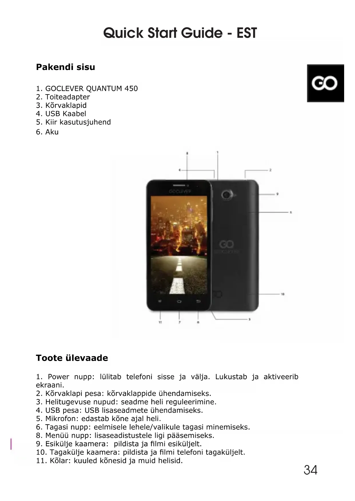 Laadige alla juhend oma Nutitelefon PDF-formaadis tasuta! Leidke oma juhend Quantum 450 - GOCLEVER ja võtke oma elektrooniline seade uuesti kätte. Sellel lehel on avaldatud kõik teie seadme kasutamiseks vajalikud dokumendid. Quantum 450 kaubamärgi GOCLEVER.