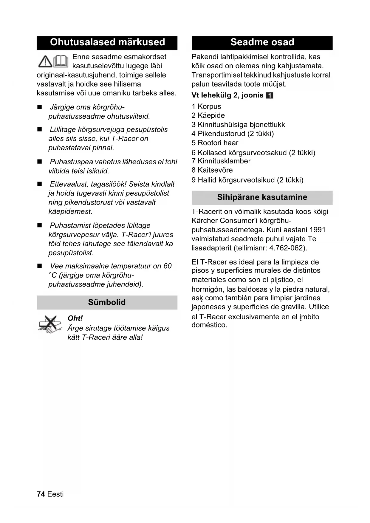 Поддръжка74 Eesti Enne sesadme esmakordset kasutuselevõttu lugege läbi originaal-kasutusjuhend, toimige sellele vastavalt ja hoidke see hilisema kasutamise või uue omaniku tarbeks alles. Järgige oma kõrgrõhu- puhastusseadme ohutusviiteid. Lülitage kõrgsurvejuga pesupüstolis alles siis sisse, kui T-Racer on puhastataval pinnal. Puhastuspea vahetus läheduses ei tohi viibida teisi isikuid. Ettevaalust, tagasilöök! Seista kindlalt ja hoida tugevasti kinni pesupüstolist ning pikendustorust või vastavalt käepidemest. Puhastamist lõpetades lülitage kõrgsurvepesur välja. T-Racer'i juures töid tehes lahutage see täiendavalt ka pesupüstolist. Vee maksimaalne temperatuur on 60 °C (järgige oma kõrgrõhu- puhastusseadme juhendeid). Oht! Ärge sirutage töötamise käigus kätt T-Raceri ääre alla! Pakendi lahtipakkimisel kontrollida, kas kõik osad on olemas ning kahjustamata. Transportimisel tekkinud kahjustuste korral palun teavitada toote müüjat. Vt lehekülg 2, joonis 1 Korpus 2 Käepide 3 Kinnitushülsiga bjonettlukk 4 Pikendustorud (2 tükki) 5 Rootori haar 6 Kollased kõrgsurveotsakud (2 tükki) 7 Kinnitusklamber 8 Kaitsevõre 9 Hallid kõrgsurveotsikud (2 tükki) T-Racerit on võimalik kasutada koos kõigi Kärcher Consumer'i kõrgrõhu- puhsatusseadmetega. Kuni aastani 1991 valmistatud seadmete puhul vajate Te lisaadapterit (tellimisnr: 4.762-062). El T-Racer es ideal para la limpieza de pisos y superficies murales de distintos materiales como son el plįstico, el hormigón, las baldosas y la piedra natural, asķ como también para limpiar jardines japoneses y superficies de gravilla. Utilice el T-Racer exclusivamente en el įmbito doméstico. Ohutusalased märkused Sümbolid Seadme osad Sihipärane kasutamineEesti 75 Et vältida takistusi kõrgsurvepesuriga töötamisel, tuleb kasutada sobivaid kõrgsurveotsikuid. Märkus: Nimirõhk (p): Vt kõrgsurvepesuri kasutusjuhend või tüübisilt. nt: K 6 – K 7, Kärcher 600 – Kärcher 770 Î Kasutage kollalseid kõrgsurveotsikuid. Märkus:Kollased kõrgsurveotsikud on juba paigaldatud. nt: K 2 – K 5, Kärcher 201 – Kärcher 560 Î Kasutage halle kõrgsurveotsikuid. Jooniseid vt volditaval leheküljel! Î Joonis 1 Kangutage kinnitusklamber kruvikeerajaga välja. 2 Tõmmae kaitsevõre ära. 3 Eemaldage klambrid. 4 Tõmmake kollalsed kõrgsurveotsikud välja. 5 Pange hallid kõrgsurveotsikud kohale. 6 Paigaldage klambrid. 7 Torgake kaitsevõre tappidele. 8 Suruge kinnitusklamber sisse, kuni see kuuldavalt asendisse fikseerub. Märkus: Kui kõrgsurvepesur imemisrežiimil töötab, tuleb kindlasti kasutada täiendavalt KÄRCHERi veefiltrit (tellinisnr: 4.730-059.0). Kinnitage T-Racer pikendustorudega pesupüstoli külge. Î Joonis 1 Suruge pikendustoru T-Racer'i bajonettlukule. 2 Seejärel keerake 90° kuni asendisse fikseerumiseni. 3 Keerake kinnitushülss kinni. – Korrake seda protsessi ka mõlema teise ühenduse puhul. Pühkige vabad pinnad enne T-Raceri kasutamist puhtaks, et vältida otsikute vigastamist. T-Racer ei sobi nühkimiseks või küürimiseks! Ettevaatust Î Joonis Ärge liikuge seadmega üle lahtiste nurkade! Kinnitage T-Racer vahetult pesupüstoli külge. Î Joonis 1 Suruge T-Raceri bajonettühendus pesupüstoli ühendusse. 2 Seejärel keerake 90° kuni asendisse fikseerumiseni. 3 Keerake kinnitushülss kinni. Ettevaatust Î Joonis Hoidke T-Racerit seinapindu puhastades alati käepidemest. Ettevalmistus Kõrgsurveotsikute valimine Kõrgsurvepesur nimirõhuga (p) 13 MPa (130 baari) kuni 16 MPa (160 baari) Kõrgsurvepesur nimirõhuga (p) alla 13 MPa (130 baari) Kõrgsurveotsikute vahetamine Kasutamine Põrandapindade puhsatamine Üldmärkusi Seinapindade puhastamine76 Eesti Kõrgsurvepesurisse ei tekki rõhku või seade pulseerib. Î Eemaldage kõrgsurveotsikud, kontrollige kõrgsurveotikuid vigastuste osas, peske T-Racer puhta veega läbi ja paigaldage kõrgsurveotsikud seejärel uuesti. Pakendmaterjalid on taaskasutatavad. Palun ärge visake pakendeid majapidamisprahi hulka, vaid suunake need taaskasutusse. Vanad seadmed sisaldavad taaskasutatavaid materjal, mis tuleks suunata taaskasutusse. Palun likvideerige vanad seadmed seetõttu vastavate kogumissüsteemide kaudu. Märkusi koostisainete kohta (REACH) Aktuaalse info koostisainete kohta leiate aadressilt: http://www.karcher.de/de/unternehmen/ umweltschutz/REACH.htm Pikendustorusid võib kasutada kõigi Kärcheri tarvikutega. Kasutage eranditult KÄRCHERi originaalvaruosi. Varuosade loend on käesoleva kasutusjuhendi lõpus. Igas riigis kehtivad meie volitatud müügiesindaja antud garantiitingimused. Seadmel esinevad rikked kõrvaldame garantiiajal tasuta, kui põhjuseks on materjali- või valmistusviga. Garantiijuhtumi korral palume pöörduda müüja või lähima volitatud klienditeenistuse poole, esitades ostu tõendava dokumendi. Puhastage seadet pärast kasutamist niiske lapiga. Abi häirete korral Üldmärkusi Keskkonnakaitse Näpunäide Varuosad Garantii HooldusLatviešu 77 Pirms pirmās lietošanas reizes izlasiet šo oriģinālo lietošanas instrukciju, rīkojieties saskaņā ar to un saglabājiet to vēlākai lietošanai vai nākamajam īpašniekam. Ievērojiet jūsu augstspiediena tīrīšanas aparāta drošības norādījumus. Augstspiediena strūklu augstspiediena pistolē aktivizējiet tikai tad, kad ierīce T- Racer atrodas uz tīrīšanas virsmas. Citas personas nedrīkst atrasties tīrīšanas galviņas tiešā tuvumā. Uzmanību - atsitiens! Ieņemiet stabilu pozīciju un stipri satveriet augstspiediena pistoli ar pagarinātājcauruli vai rokturi. Beidzot tīrīšanas procesu, izslēdziet augstspiediena tīrītāju. Strādājot ierīces T-Racer tuvumā, papildus atvienojiet to no augstspiediena pistoles. Maksimālā ūdens temperatūra ir 60 °C (ievērojiet jūsu augstspiediena tīrīšanas aparāta drošības norādījumus). Bīstami! Ierīces darbības laikā netveriet zem T-Racer malas! Izsaiņojot pārbaudiet, vai 