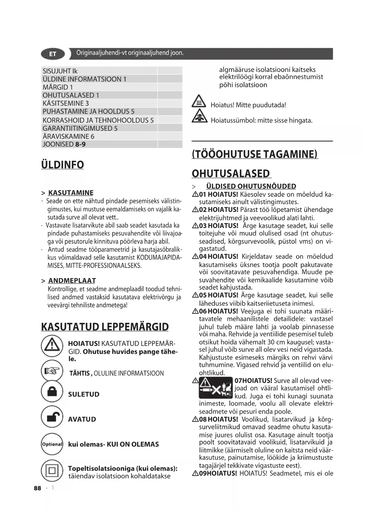 ning ülekuumenemist, mis on alati ohtlik.. OLULINE ETTEVAATUSABINÕU Pärast masina väl- jalülitamist tühjendage alatisurvevoolik, vajutades püstoli päästikule.. 4 -ET