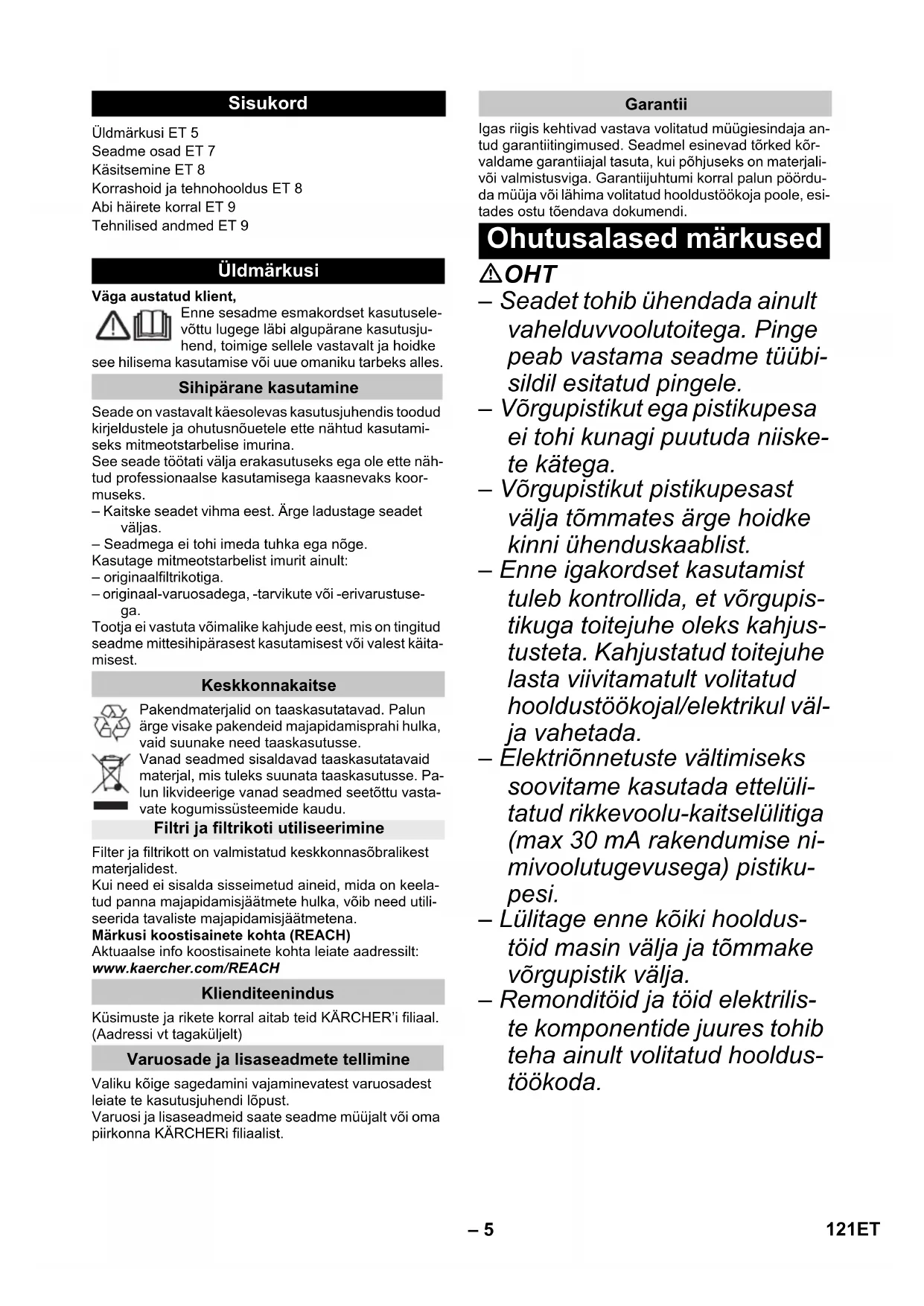 10 л Захранващ кабел H05VV-F 2x0,75 Допустимо ниво на шум (EN 60704-2-1) 72 dB(A) Тегло (без принадлежности) WD 4 7,0 кг Тегло (без принадлежности) WD 4 Premium 7,3 кг 120 BG– 5 Väga austatud klient, Enne sesadme esmakordset kasutusele- võttu lugege läbi algupärane kasutusju- hend, toimige sellele vastavalt ja hoidke see hilisema kasutamise või uue omaniku tarbeks alles. Seade on vastavalt käesolevas kasutusjuhendis toodud kirjeldustele ja ohutusnõuetele ette nähtud kasutami- seks mitmeotstarbelise imurina. See seade töötati välja erakasutuseks ega ole ette näh- tud professionaalse kasutamisega kaasnevaks koor- museks. – Kaitske seadet vihma eest. Ärge ladustage seadet väljas. – Seadmega ei tohi imeda tuhka ega nõge. Kasutage mitmeotstarbelist imurit ainult: – originaalfiltrikotiga. – originaal-varuosadega, -tarvikute või -erivarustuse- ga. Tootja ei vastuta võimalike kahjude eest, mis on tingitud seadme mittesihipärasest kasutamisest või valest käita- misest. Pakendmaterjalid on taaskasutatavad. Palun ärge visake pakendeid majapidamisprahi hulka, vaid suunake need taaskasutusse. Vanad seadmed sisaldavad taaskasutatavaid materjal, mis tuleks suunata taaskasutusse. Pa- lun likvideerige vanad seadmed seetõttu vasta- vate kogumissüsteemide kaudu. Filter ja filtrikott on valmistatud keskkonnasõbralikest materjalidest. Kui need ei sisalda sisseimetud aineid, mida on keela- tud panna majapidamisjäätmete hulka, võib need utili- seerida tavaliste majapidamisjäätmetena. Märkusi koostisainete kohta (REACH) Aktuaalse info koostisainete kohta leiate aadressilt: www.kaercher.com/REACH Küsimuste ja rikete korral aitab teid KÄRCHER’i filiaal. (Aadressi vt tagaküljelt) Valiku kõige sagedamini vajaminevatest varuosadest leiate te kasutusjuhendi lõpust. Varuosi ja lisaseadmeid saate seadme müüjalt või oma piirkonna KÄRCHERi filiaalist. Igas riigis kehtivad vastava volitatud müügiesindaja an- tud garantiitingimused. Seadmel esinevad tõrked kõr- valdame garantiiajal tasuta, kui põhjuseks on materjali- või valmistusviga. Garantiijuhtumi korral palun pöördu- da müüja või lähima volitatud hooldustöökoja poole, esi- tades ostu tõendava dokumendi. OHT – Seadet tohib ühendada ainult vahelduvvoolutoitega. Pinge peab vastama seadme tüübi- sildil esitatud pingele. – Võrgupistikut ega pistikupesa ei tohi kunagi puutuda niiske- te kätega. – Võrgupistikut pistikupesast välja tõmmates ärge hoidke kinni ühenduskaablist. – Enne igakordset kasutamist tuleb kontrollida, et võrgupis- tikuga toitejuhe oleks kahjus- tusteta. Kahjustatud toitejuhe lasta viivitamatult volitatud hooldustöökojal/elektrikul väl- ja vahetada. – Elektriõnnetuste vältimiseks soovitame kasutada ettelüli- tatud rikkevoolu-kaitselülitiga (max 30 mA rakendumise ni- mivoolutugevusega) pistiku- pesi. – Lülitage enne kõiki hooldus- töid masin välja ja tõmmake võrgupistik välja. – Remonditöid ja töid elektrilis- te komponentide juures tohib teha ainult volitatud hooldus- töökoda. Sisukord Üldmärkusi ET 5 Seadme osad ET 7 Käsitsemine ET 8 Korrashoid ja tehnohooldus ET 8 Abi häirete korral ET 9 Tehnilised andmed ET 9 Üldmärkusi Sihipärane kasutamine Keskkonnakaitse Filtri ja filtrikoti utiliseerimine Klienditeenindus Varuosade ja lisaseadmete tellimine Garantii Ohutusalased märkused 121ET– 6 HOIATUS – Seda seadet ei tohi kasutada piiratud füüsiliste, sensoorse- te või vaimsete võimetega ini- mesed või kogemuste ja/või teadmisteta isikud; kui siis ai- nult nende ohutuse eest vas- tutava isiku järelevalve all või kui neid on õpetatud seadet kasutama ja nad on mõistnud sellest tulenevaid ohtusid. – Lastel on lubatud kasutada seadet vaid juhul, kui nad on üle 8 aasta vanad ja kui nen- de üle teostab järelvalvet mõni nende ohutuse eest vastutav isik või on lapsed saanud temalt juhiseid sead- me kasutamise kohta ja mõistnud sellega kaasnevaid ohtusid. – Lapsed ei tohi seadmega mängida. – Laste üle peab olema järele- valve tagamaks, et nad sead- mega ei mängiks. – Puhastamist ja kasutajahool- dust ei tohi teostada lapsed ilma järelevalveta. – Hoidke pakendikiled lastele kättesaamatuna - lämbumis- oht! – Lülitage masin pärast iga ka- sutamists ja enne iga puhas- tamist/hooldust välja. – Tuleoht. Ärge imege masi- nasse põlevaid ega hõõgu- vaid esemeid. – Plahvatusohtlikes piirkonda- des kasutamine on keelatud. – Vahu tekkimise või vedeliku lekkimise korral lülitage ma- sin kohe välja või tõmmake välja toitepistik! – Ärge kasutage küürimisva- hendeid ega klaasi- või uni- versaalpuhastusvahendeid! Ärge sukeldage seadet kuna- gi vette. Mõned ained võivad imiõhu kee- rises moodustada plahvatusoht- liku auru või gaasisegu! Ärge kunagi kasutage imurit järgmiste ainete eemaldami- seks: – Plahvatusohtlikud või kerges- tisüttivad gaasid, vedelikud ja tolm (reaktiivne tolm) – Reaktiivne metallitolm (nt alu- miinium, magneesium, tsink) ühenduses tugevasti leelise- liste ja happeliste puhastus- vahenditega – Lahjendamata kanged hap- ped ja alused – Orgaanilised lahused (nt ben- siin, värvilahustid, atsetoon, kütteõli). Lisaks võivad need ained kah- justada seadme valmistamisel kasutatud materjale. OHT Osutab vahetult ähvardavale ohule, mis võib põhjustada tõsi- seid kehavigastusi või lõppeda surmaga. Ohuastmed 122 ET– 7 몇 HOIATUS Osutab võimalikule ohtlikule olu- korrale, mis võib põhjustada tõ- siseid kehavigastusi või lõppeda surmaga. 몇 ETTEVAATUS Viide võimalikule ohtlikule olu- korrale, mis võib põhjustada ker- geid vigastusi. TÄHELEPANU Viide võimalikule ohtlikule olu- korrale, mis võib põhjustada ma- teriaalset kahju. Jooniseid vt volditaval leheküljel! Selles kasutusjuhendis kirjeldatakse eesmisel ümbrisel loetletud mitmeotstarbelist imu- rit. Joonistel on kujutatud mak