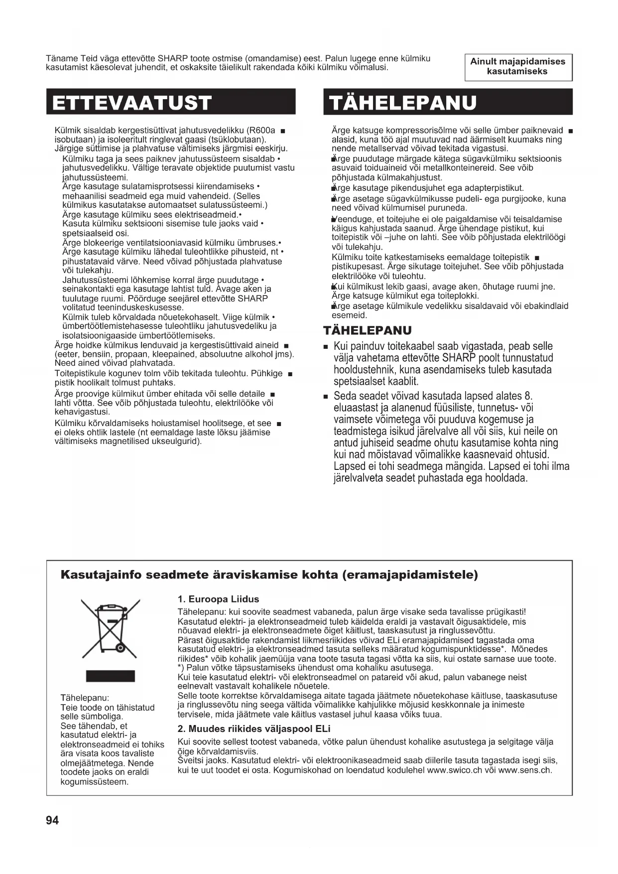 Täname Teid väga ettevõtte SHARP toote ostmise (omandamise) eest. Palun lugege enne külmiku