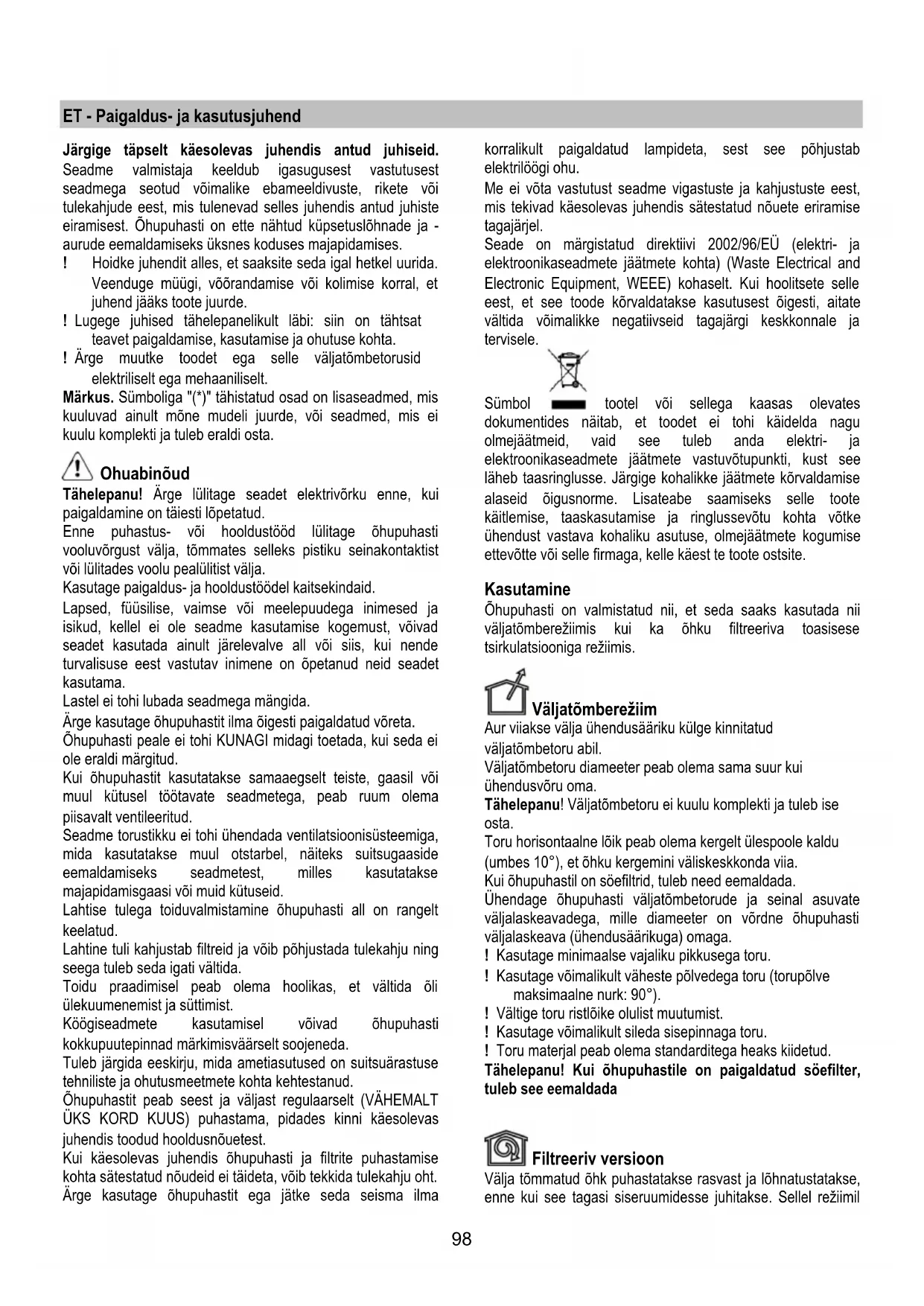 ! Ärge muutke toodet ega selle väljatõmbetorusid