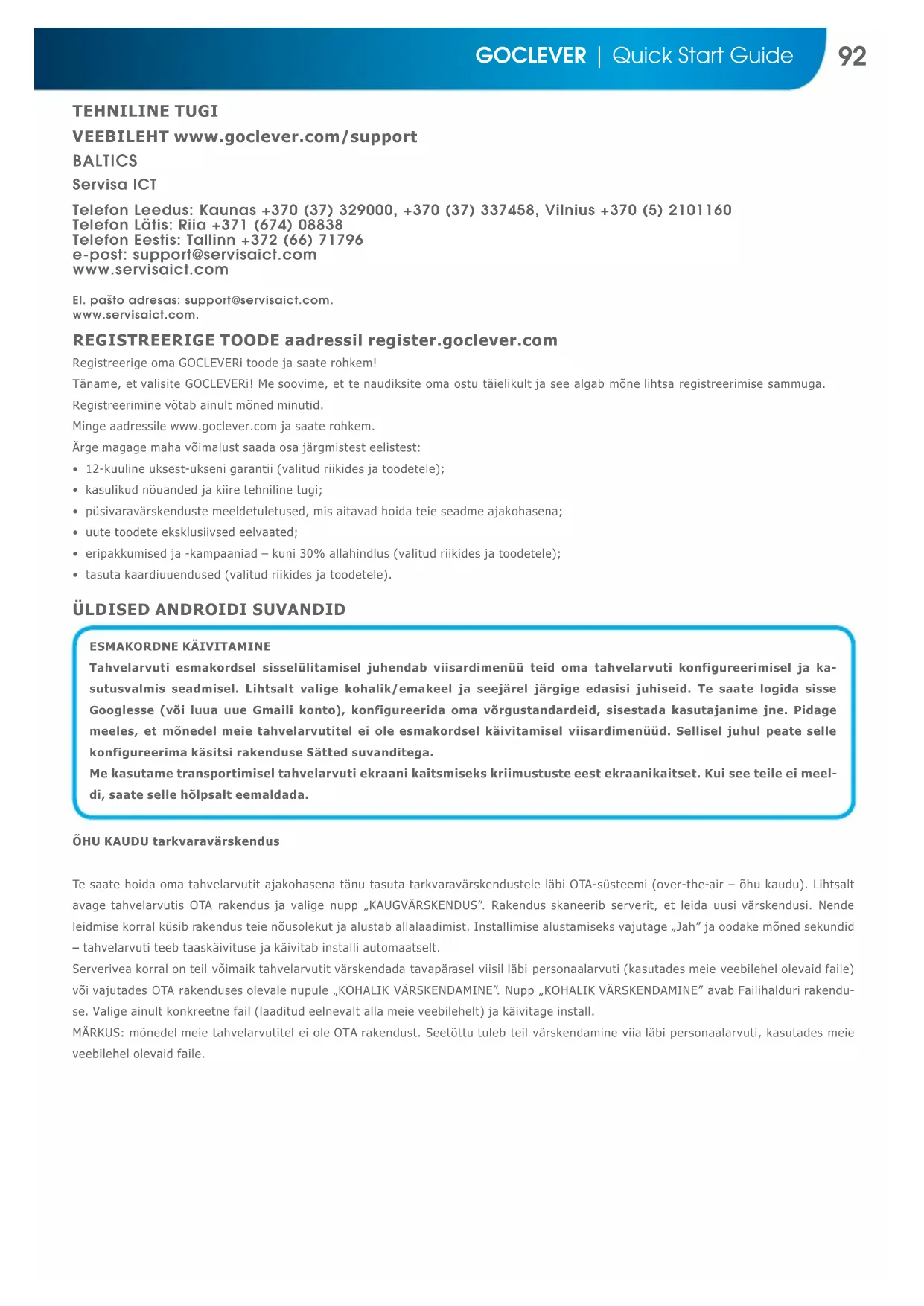 Tahvelarvuti esmakordsel sisselülitamisel juhendab viisardimenüü teid oma tahvelarvuti konfigureerimisel ja ka- sutusvalmis seadmisel. Lihtsalt valige kohalik/emakeel ja seejärel järgige edasisi juhiseid. Te saate logida sisse Googlesse (või luua uue Gmaili konto), konfigureerida oma võrgustandardeid, sisestada kasutajanime jne. Pidage meeles, et mõnedel meie tahvelarvutitel ei ole esmakordsel käivitamisel viisardimenüüd. Sellisel juhul peate selle konfigureerima käsitsi rakenduse Sätted suvanditega. Me kasutame transportimisel tahvelarvuti ekraani kaitsmiseks kriimustuste eest ekraanikaitset. Kui see teile ei meel- di, saate selle hõlpsalt eemaldada. REGISTREERIGE TOODE aadressil register.goclever.com Registreerige oma GOCLEVERi toode ja saate rohkem! Täname, et valisite GOCLEVERi! Me soovime, et te naudiksite oma ostu täielikult ja see algab mõne lihtsa registreerimise sammuga. Registreerimine võtab ainult mõned minutid. Minge aadressile www.goclever.com ja saate rohkem. Ärge magage maha võimalust saada osa järgmistest eelistest: